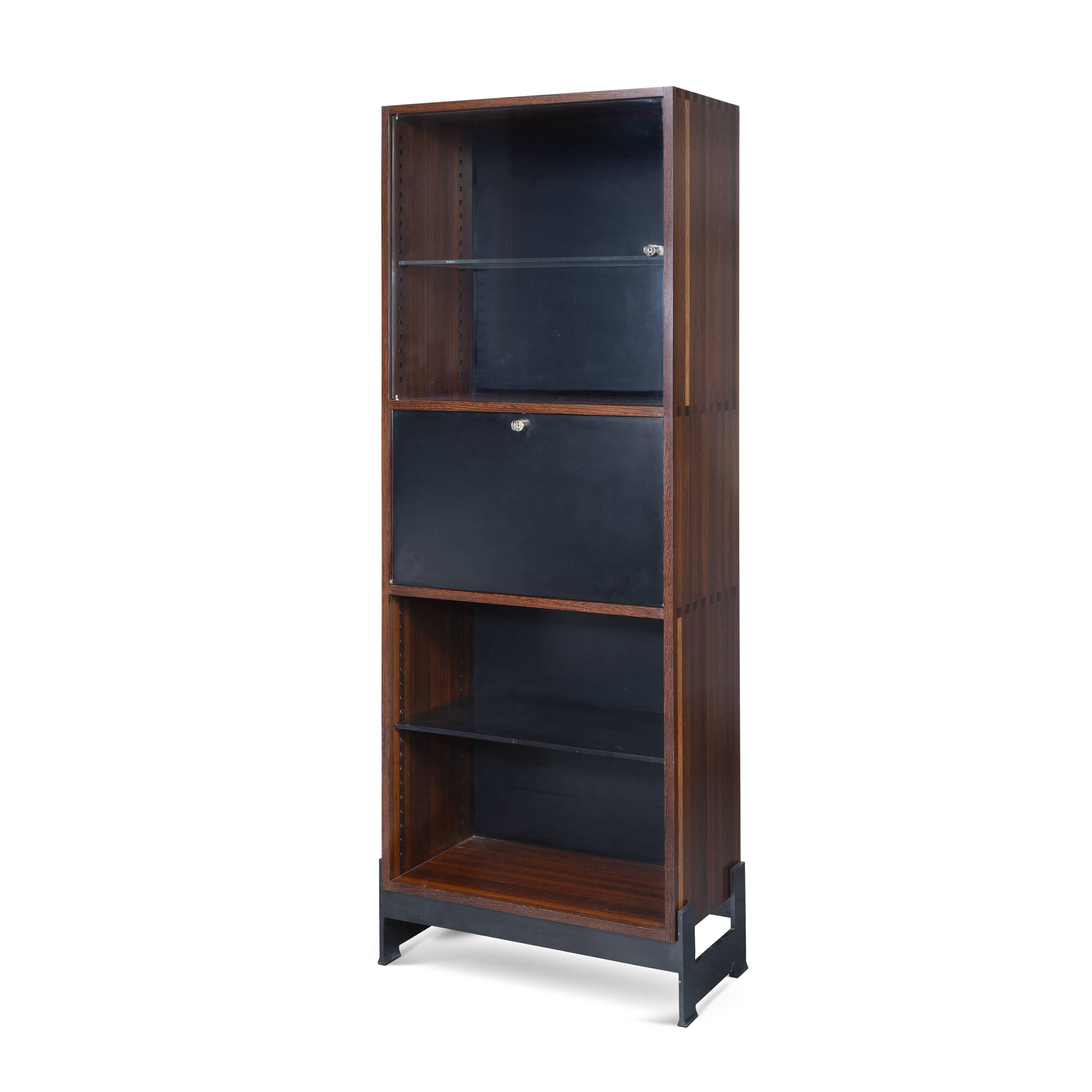 Drop-front secretary in wenge and gunmetal-finished steel, model created in 1955.