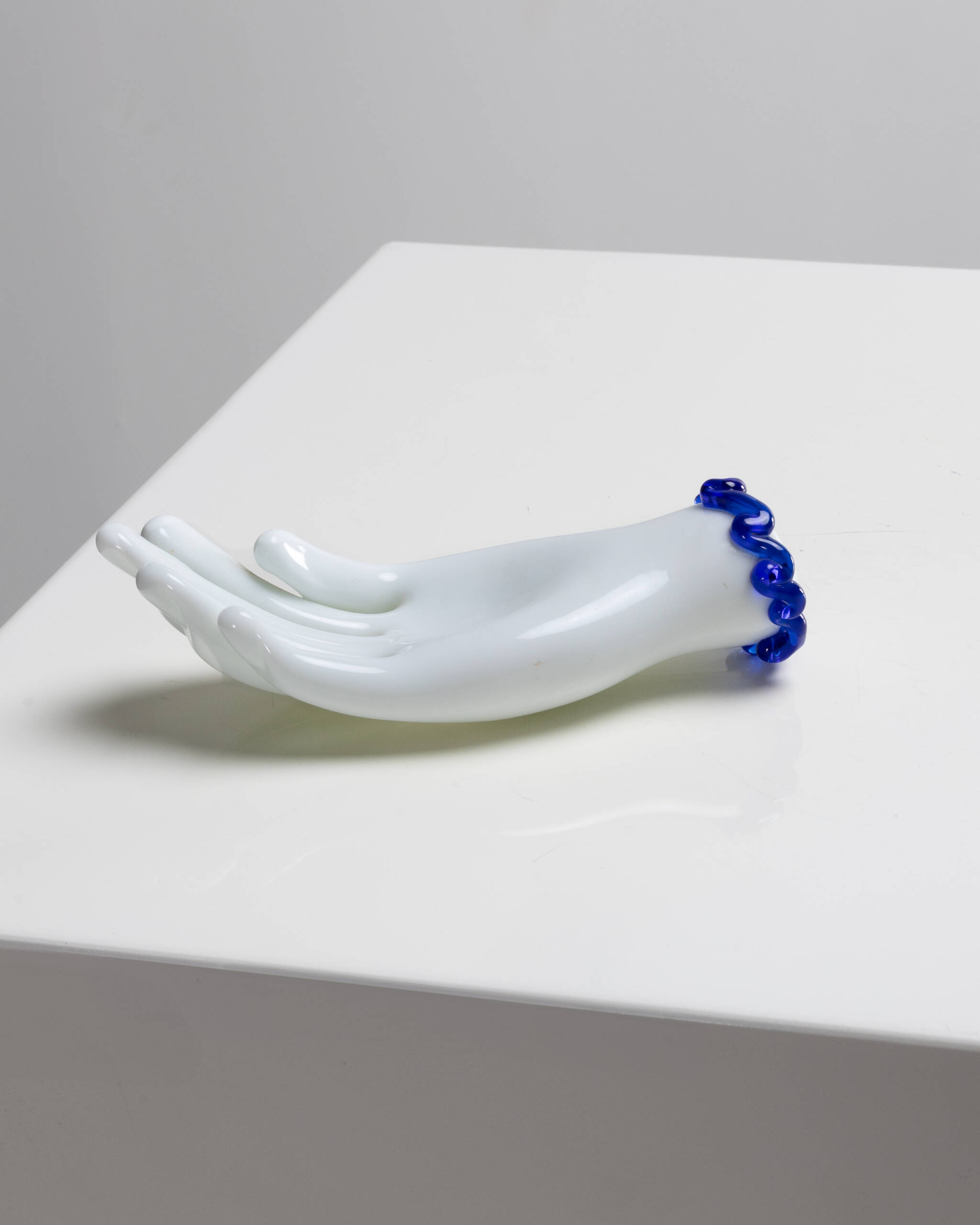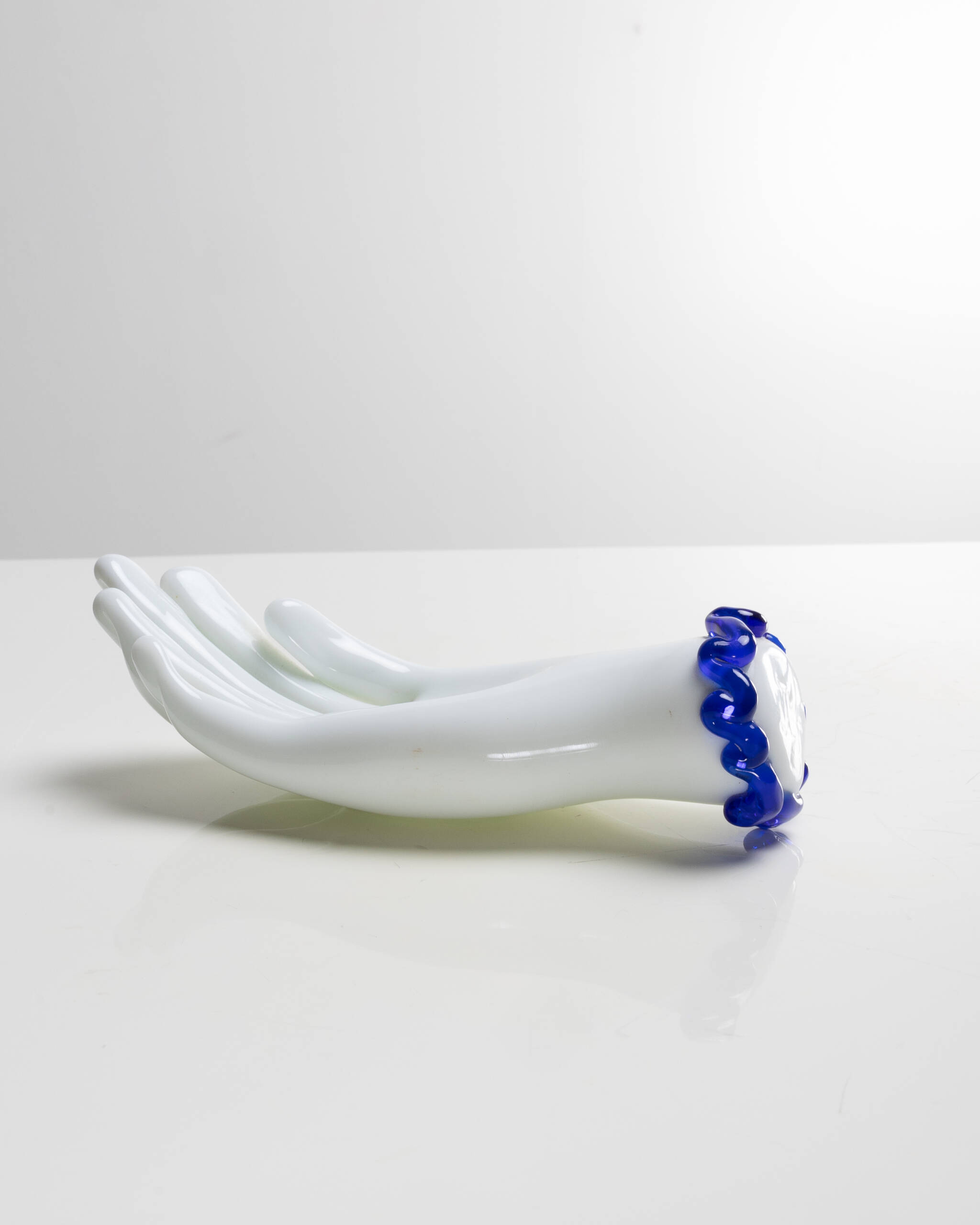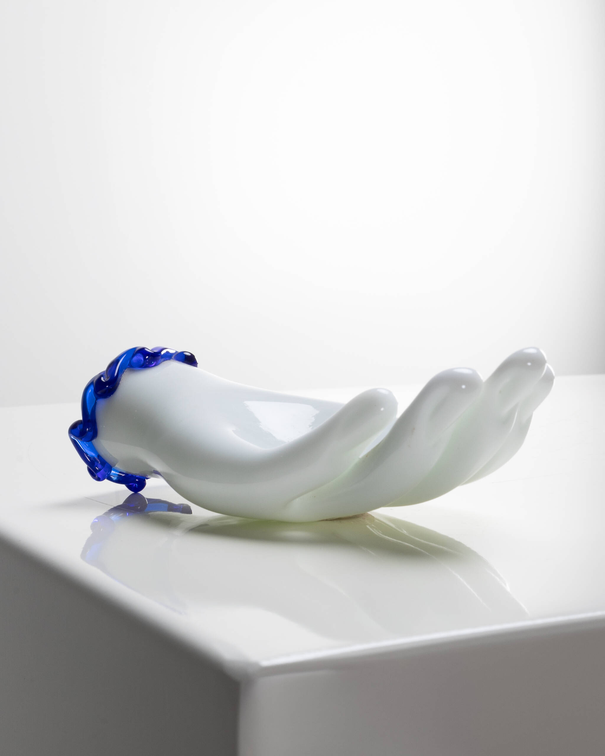 Glove in Murano “lattimo” white glass decorated with a nice ondulated blue border. The palm is slightly concave.