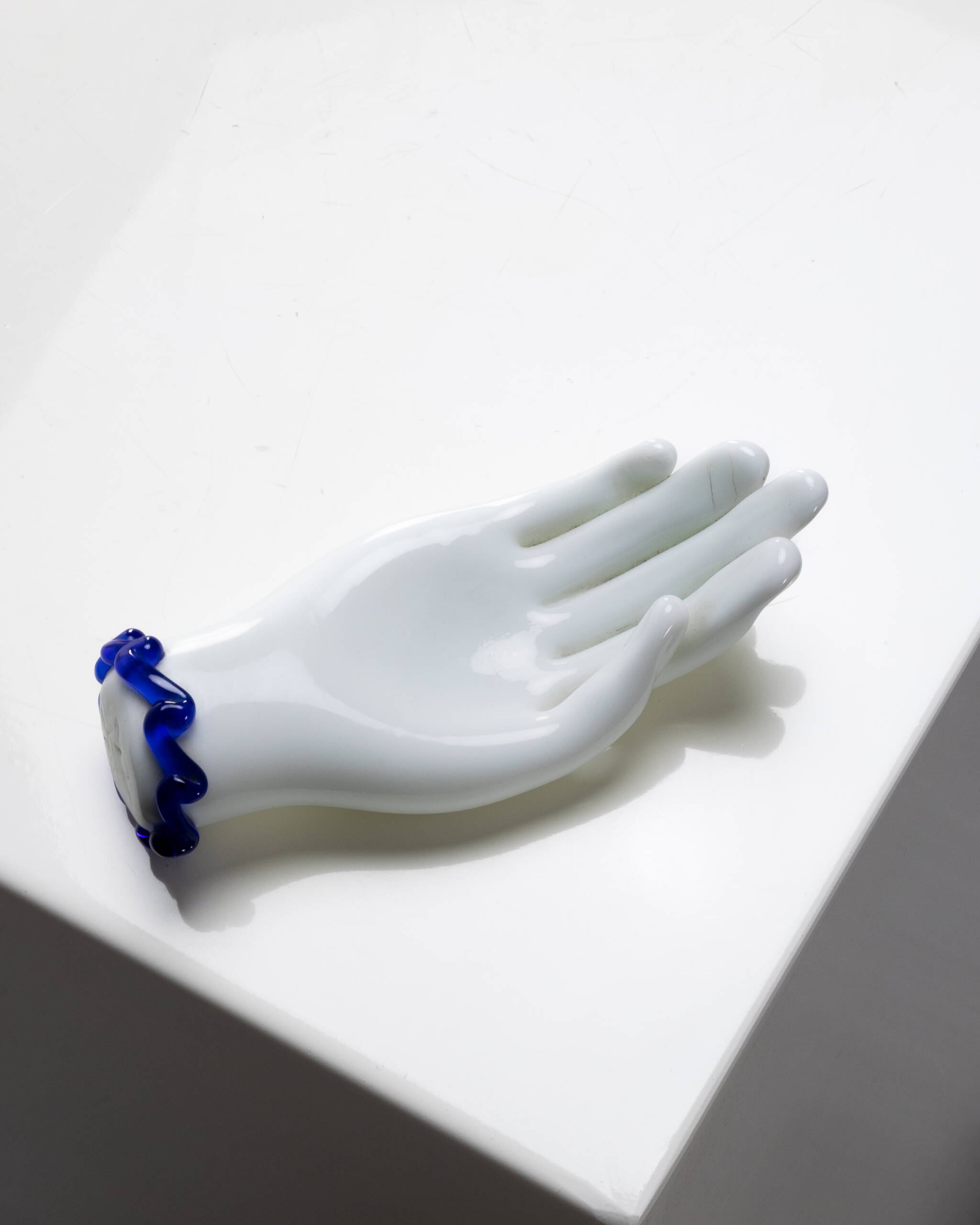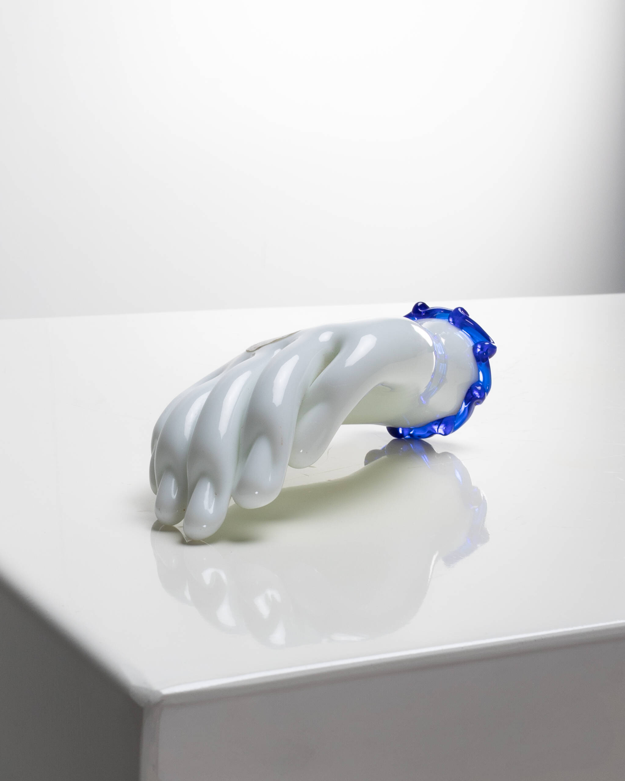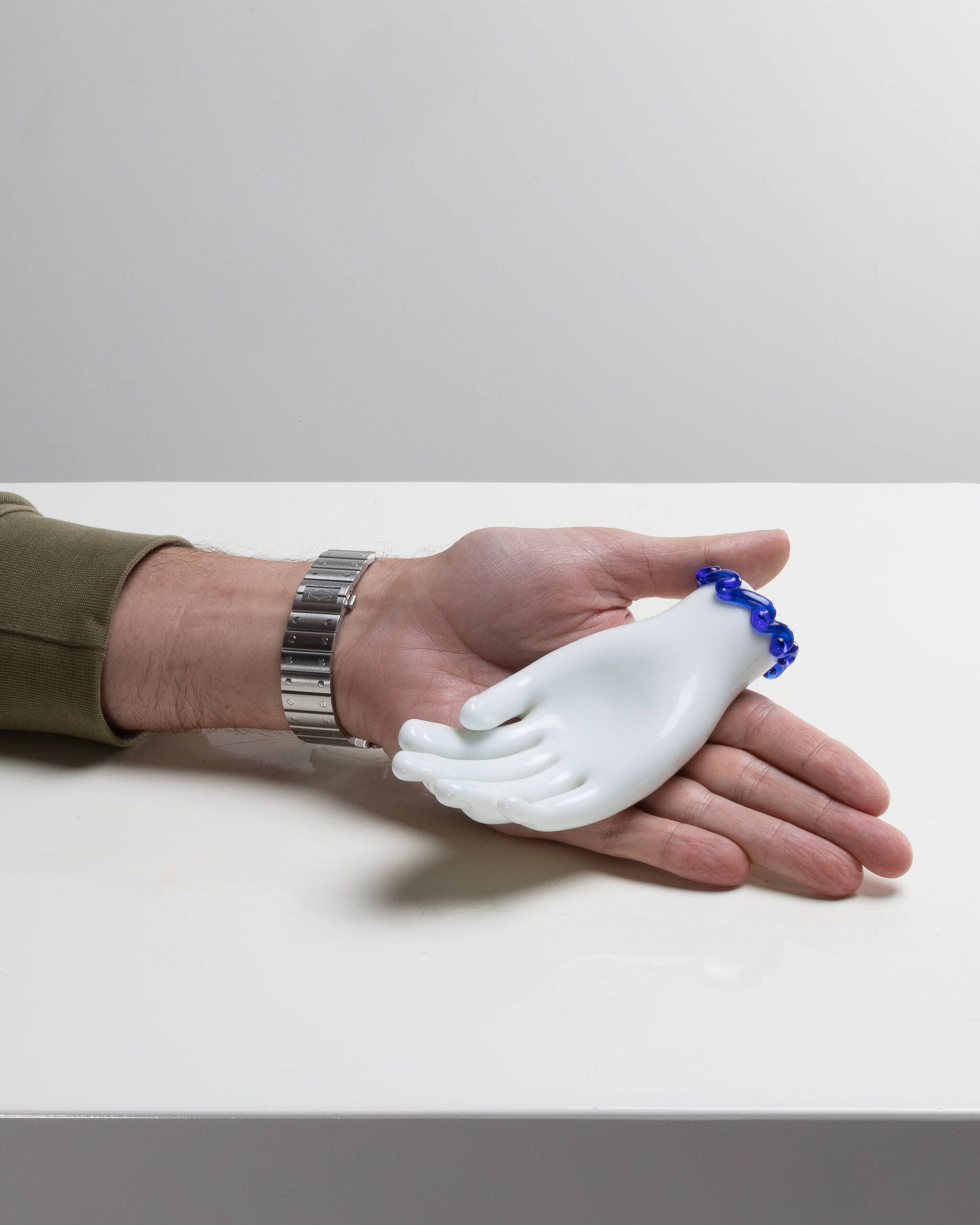 Glove in Murano “lattimo” white glass decorated with a nice ondulated blue border. The palm is slightly concave.