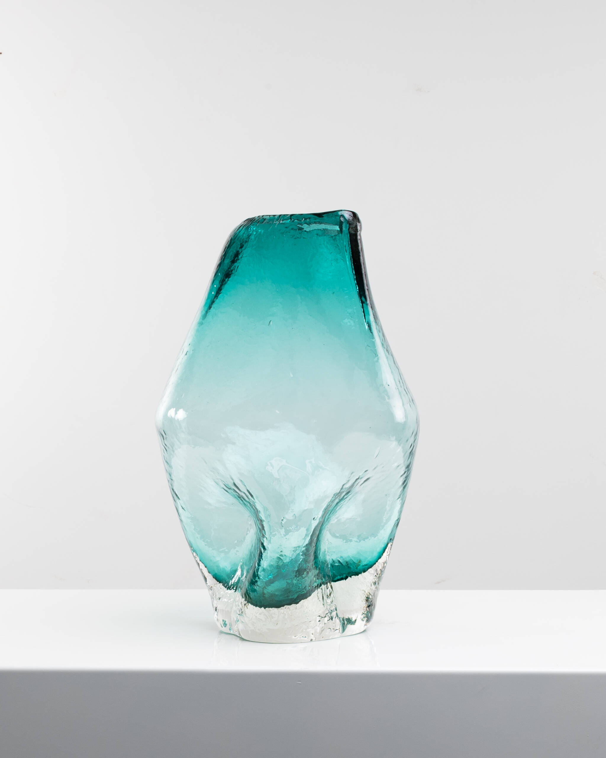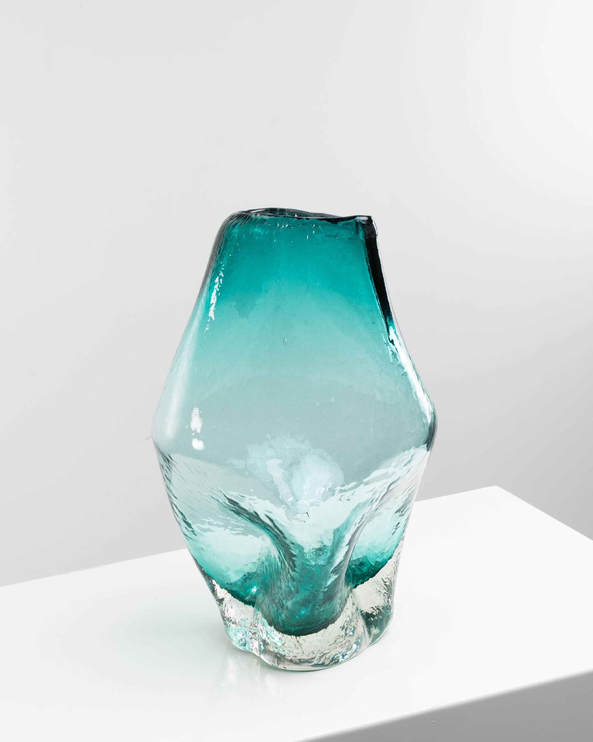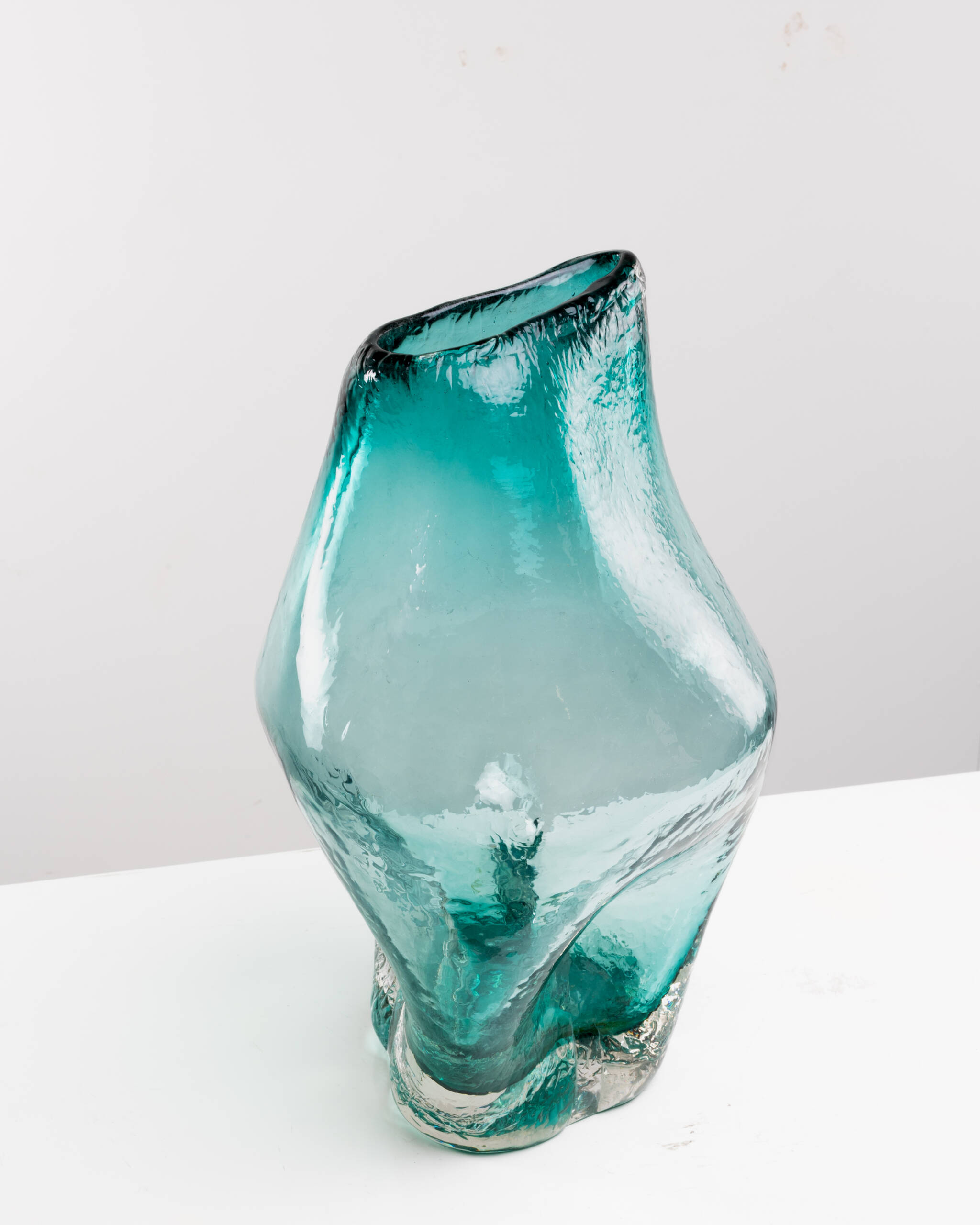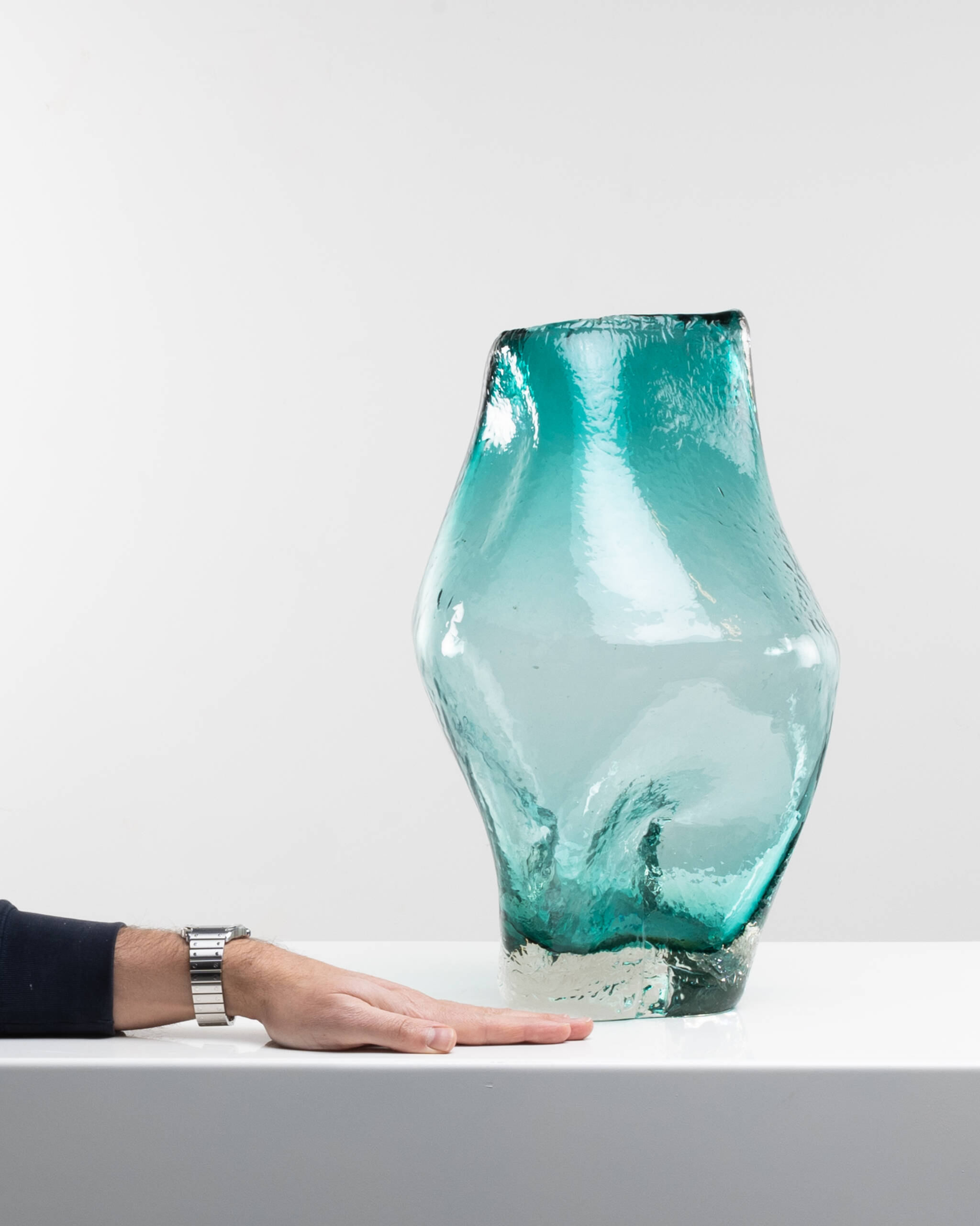 Blown Murano glass vase with a free and organic silhouette, characteristic of the Informale series developed by Bianconi in the late 1960s. The asymmetrical body, animated by deliberately irregular deformations, highlights a thick and dense material, giving the piece a strong sculptural presence. Aquatic shades of water green, subtly intensified toward the base, interact with a surface marked by shifting effects, capturing and diffusing light with depth.