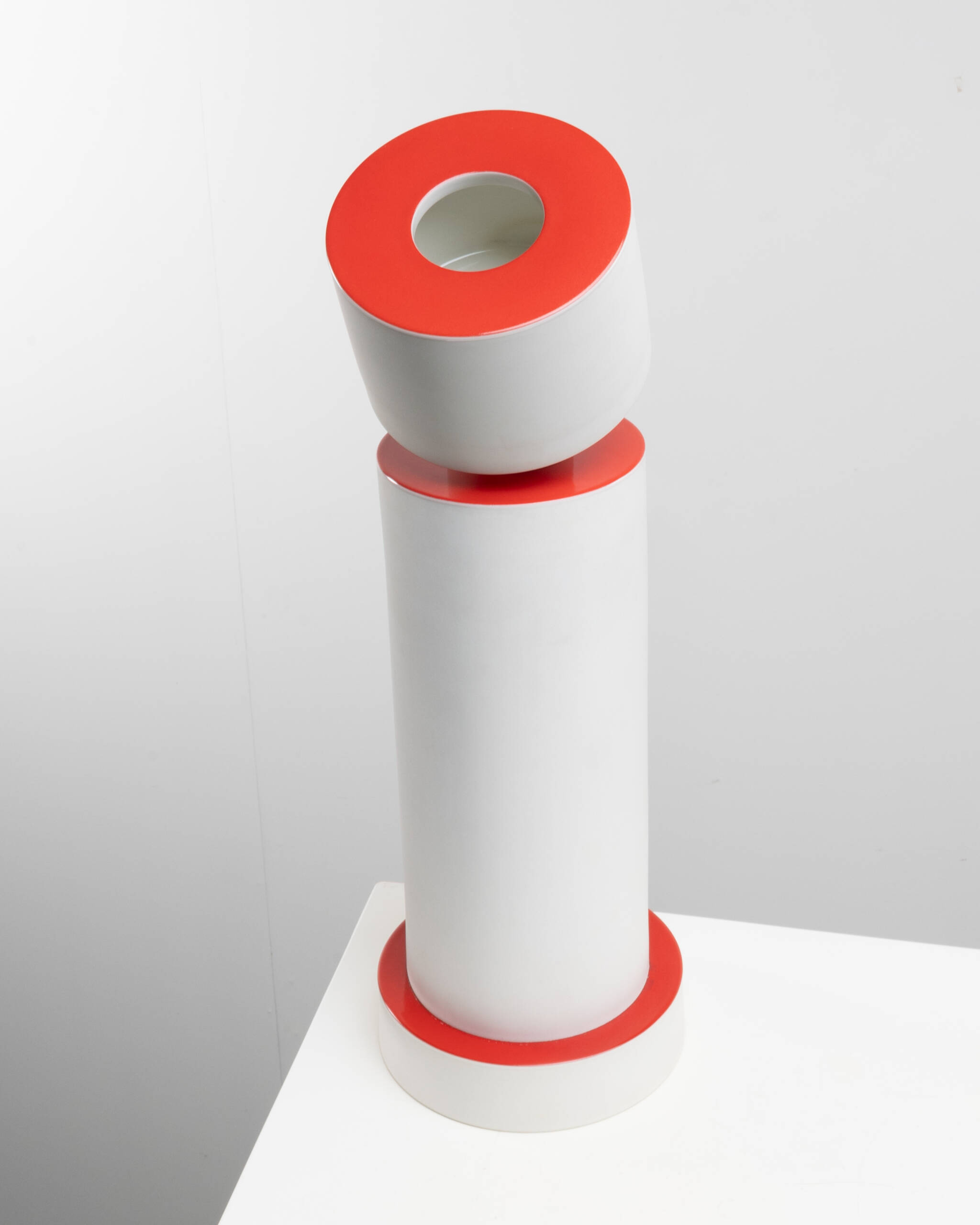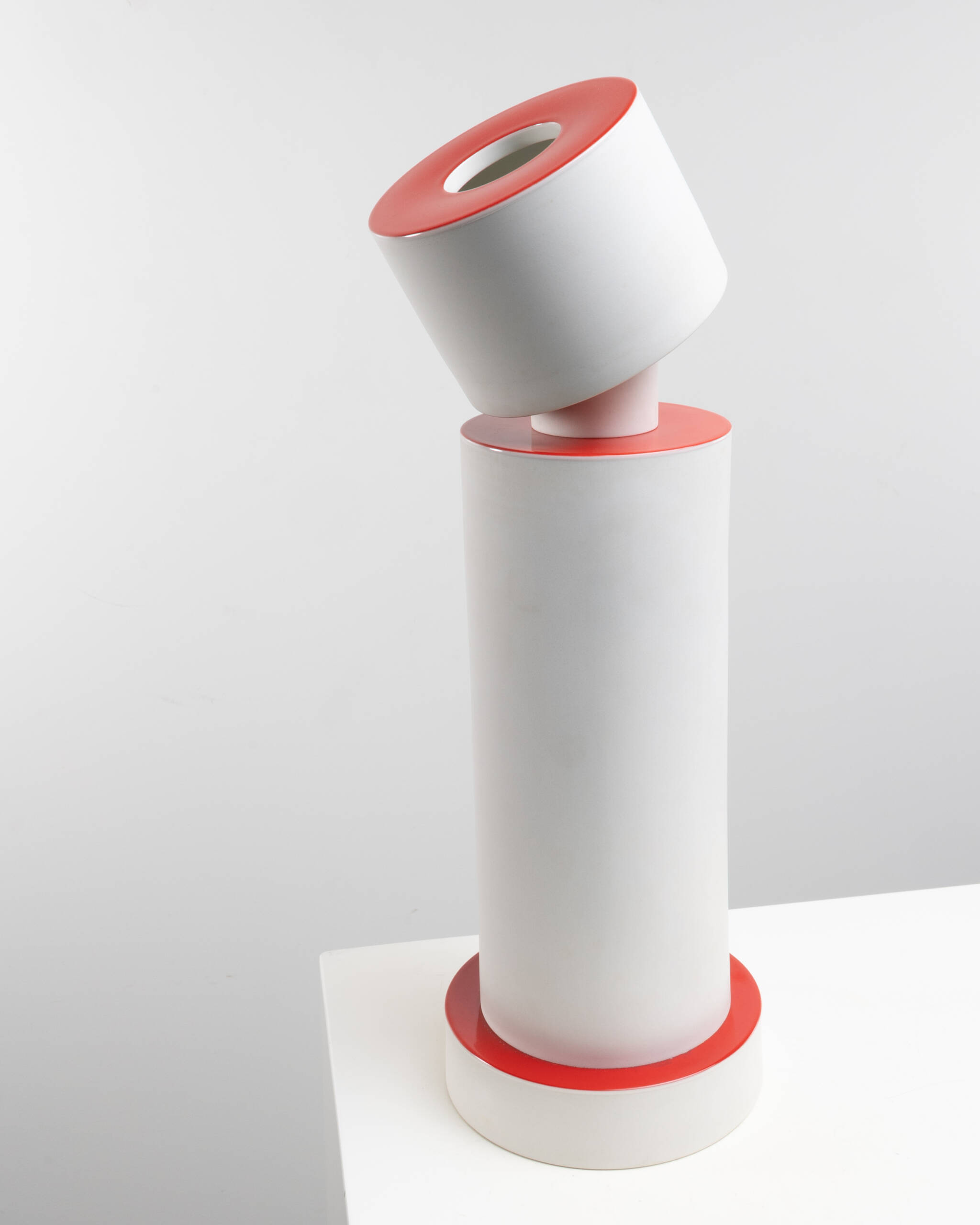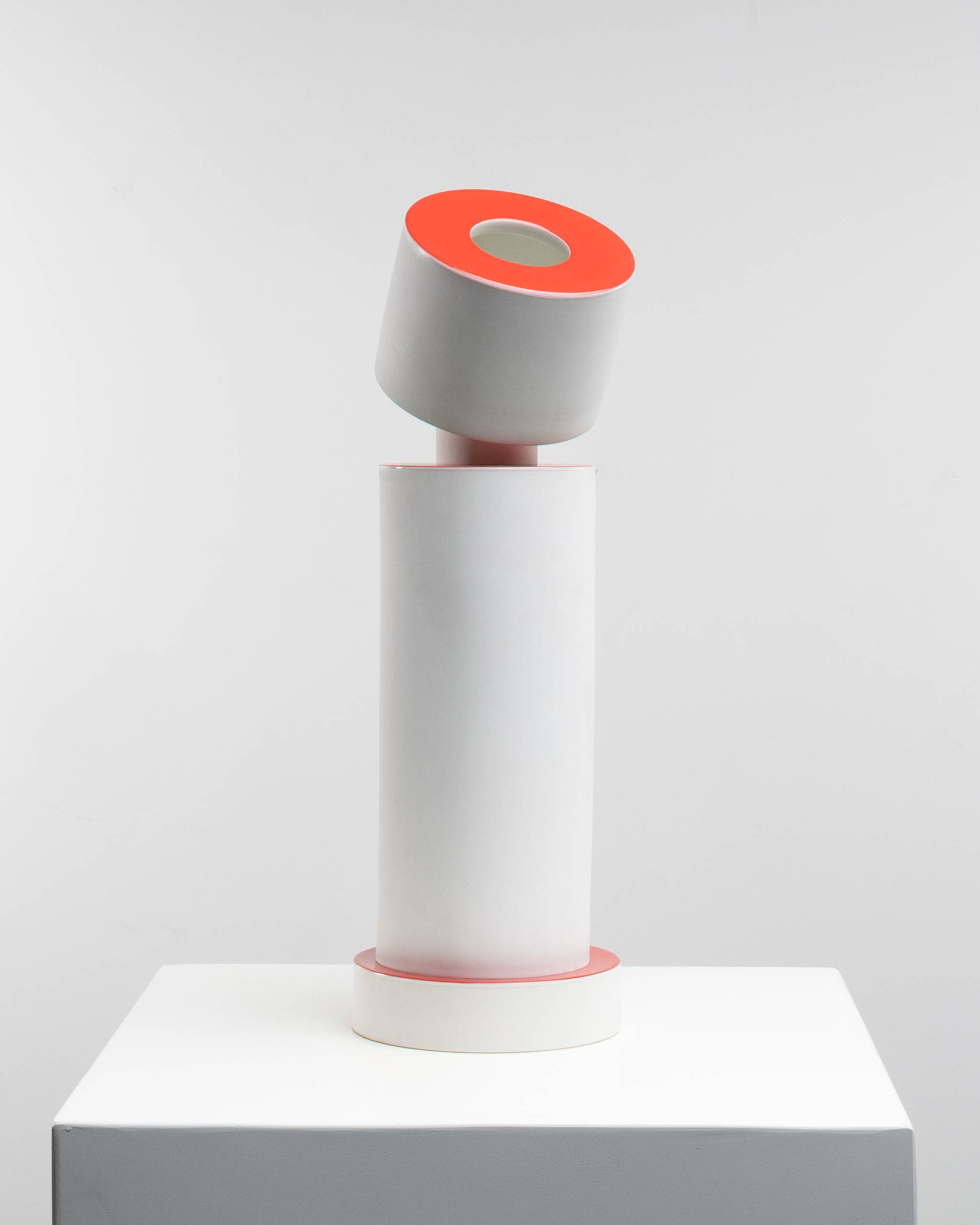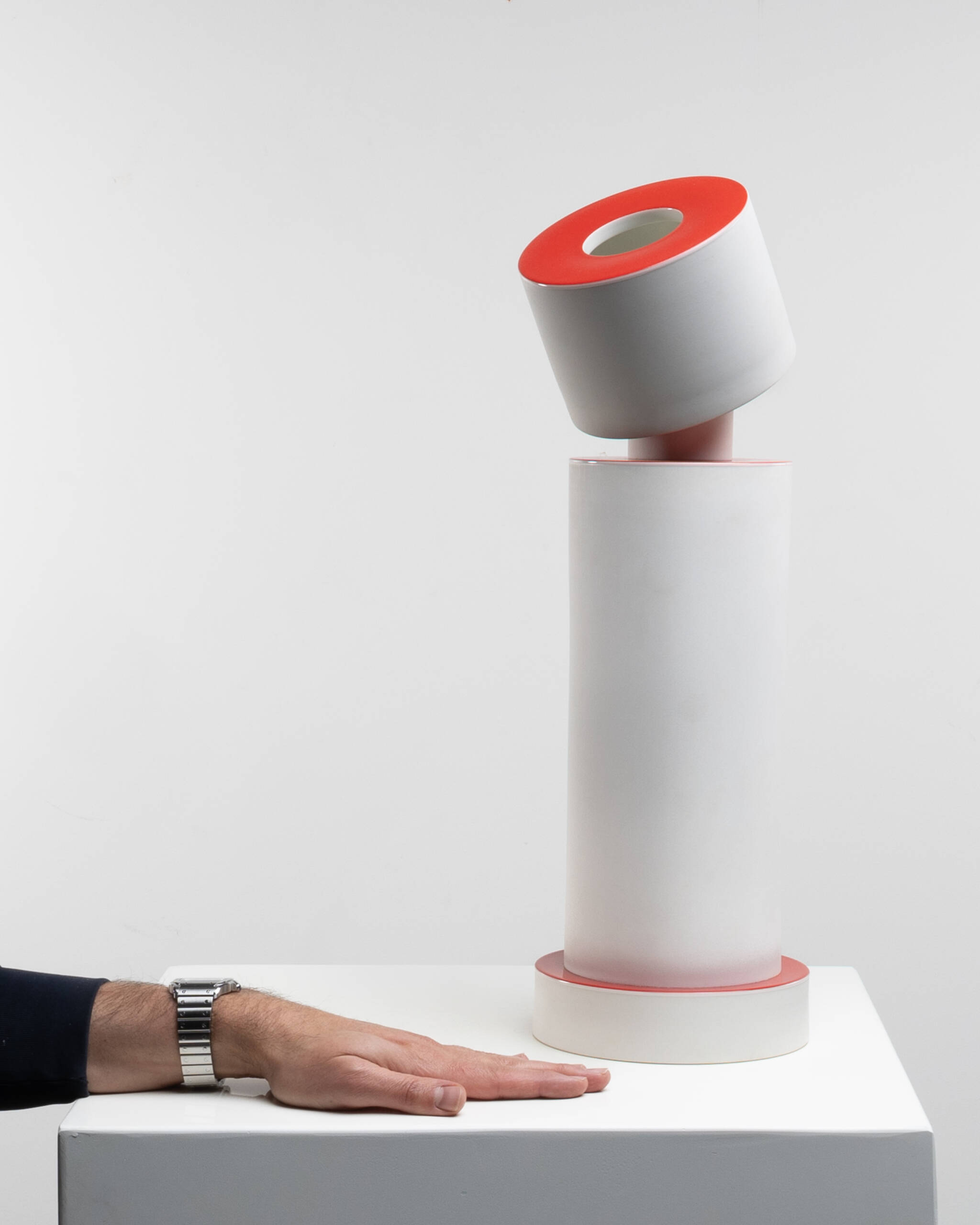 The piece is composed of a geometric stacking of cylindrical volumes in matte white porcelain, punctuated by horizontal discs glazed in a vivid coral red. The ensemble plays on balance, verticality and deliberate displacement: a slightly tilted upper cylinder breaks the main axis and lends the object an almost anthropomorphic presence.