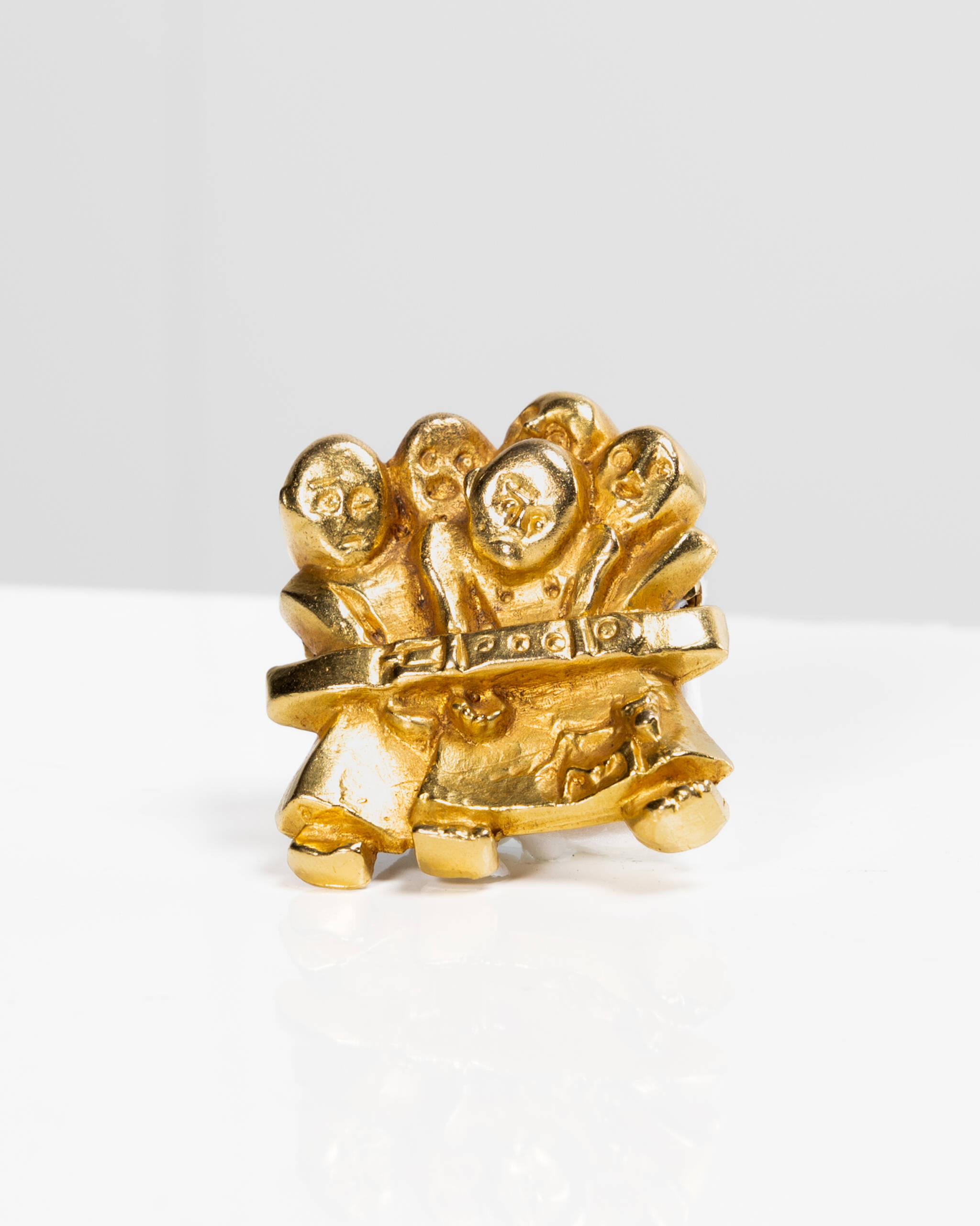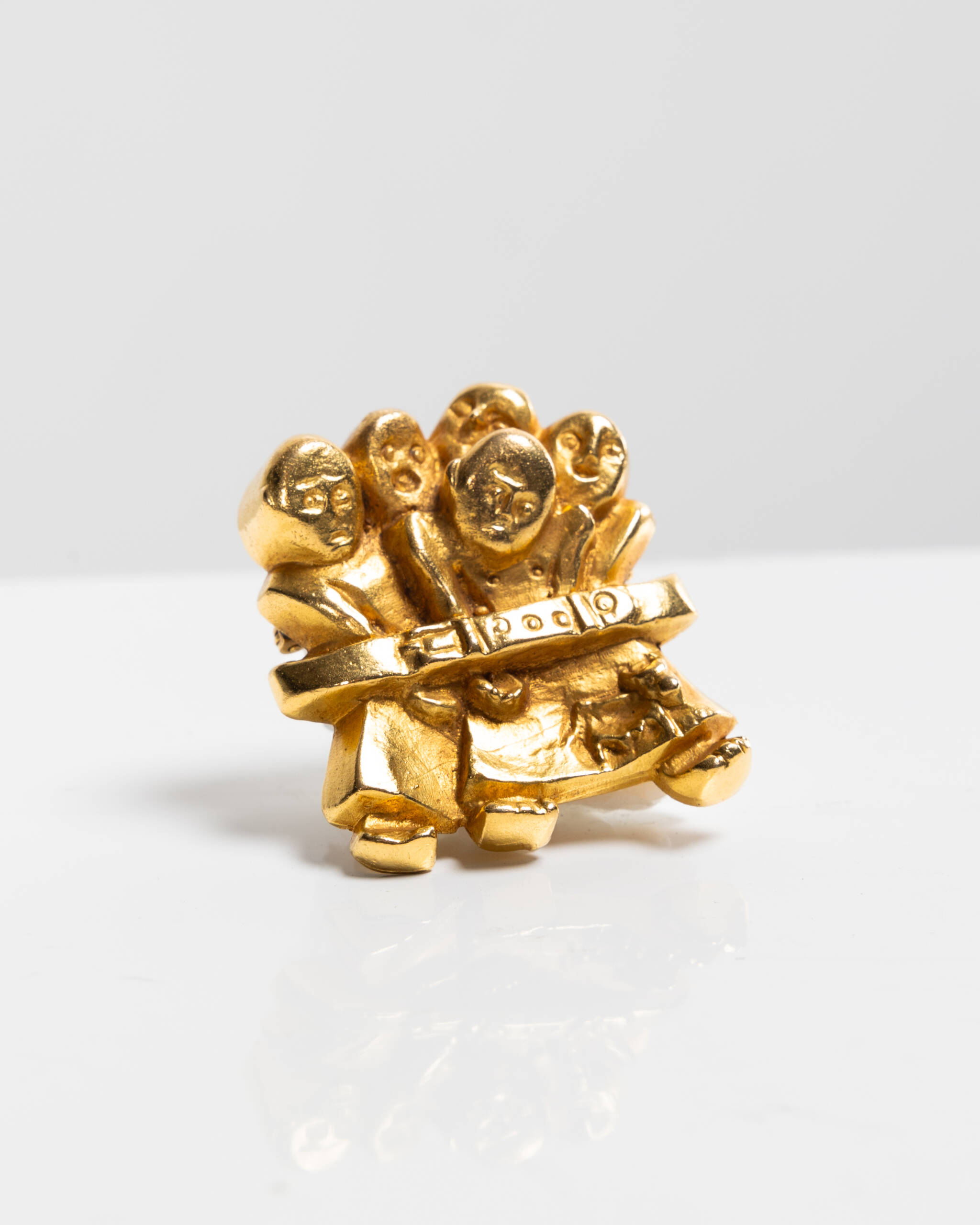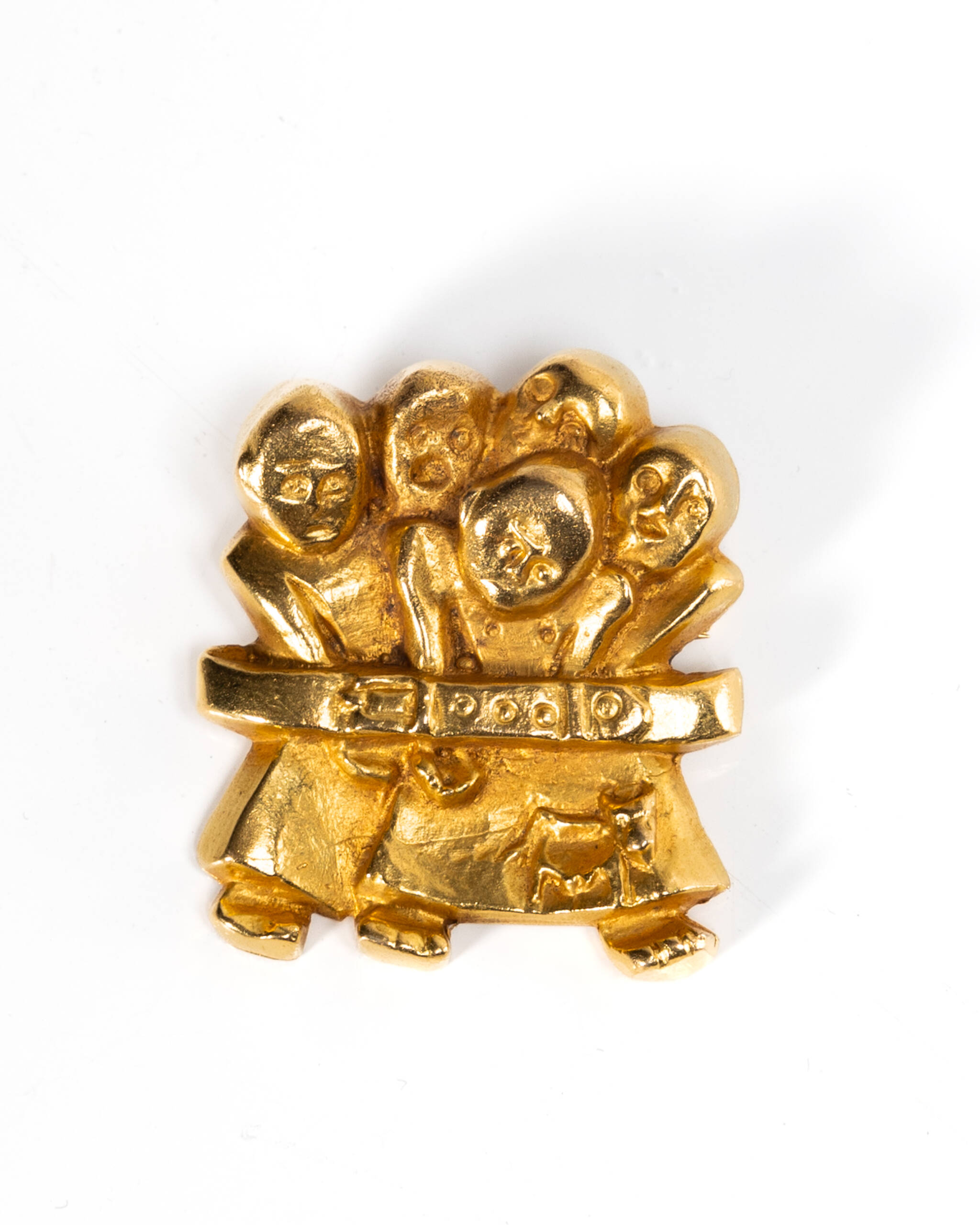 Figurative gilt bronze brooch depicting a group of stylized figures bound together by a tightly cinched belt, accompanied by a relief motif of a lean cow. An emblematic work of Line Vautrin’s satirical and socially engaged spirit, this brooch humorously and poetically evokes the economic hardships and collective solidarity of the post-war period. Both jewel and miniature sculpture, it illustrates the artist’s ability to transform popular language into a symbolic and expressive object.