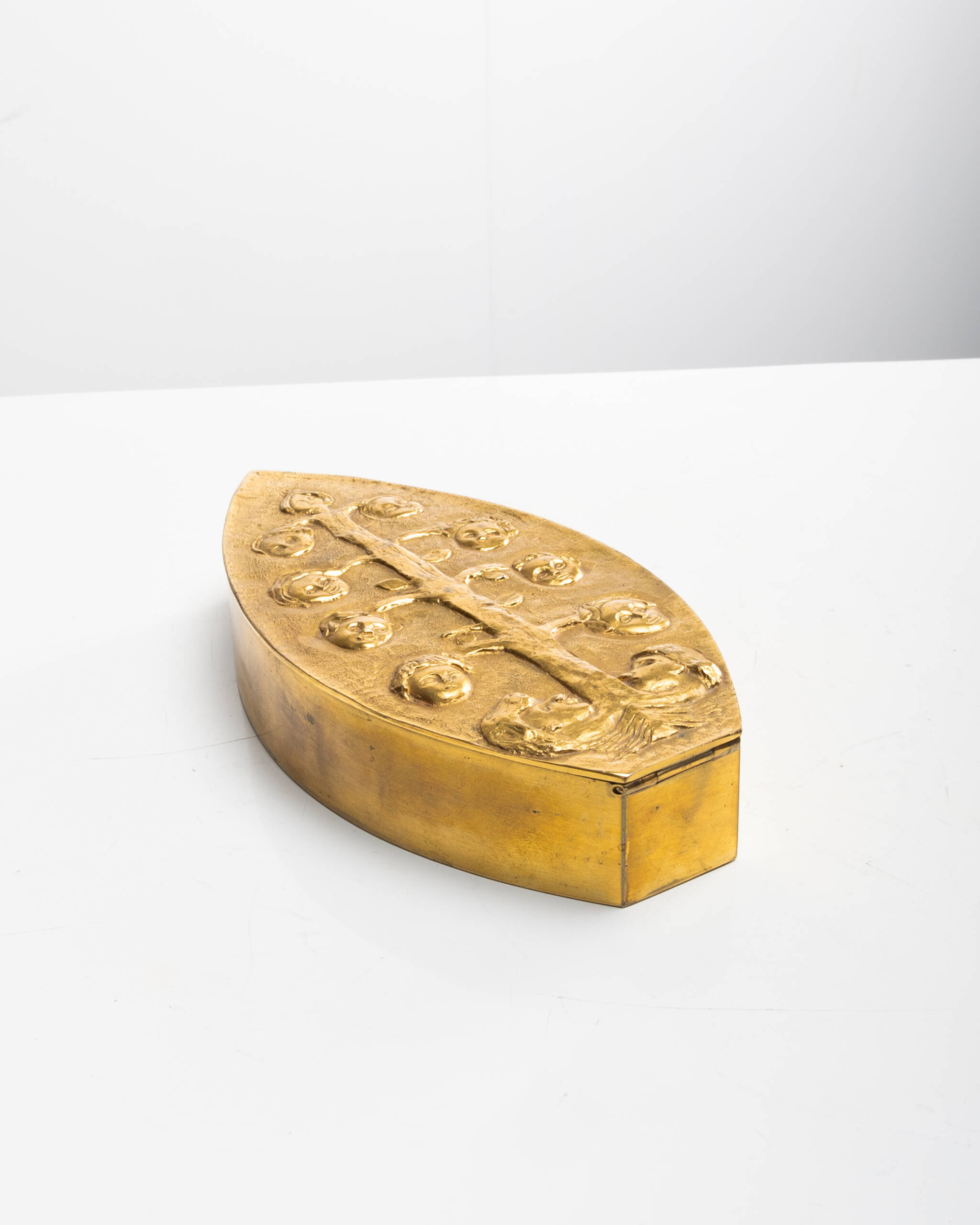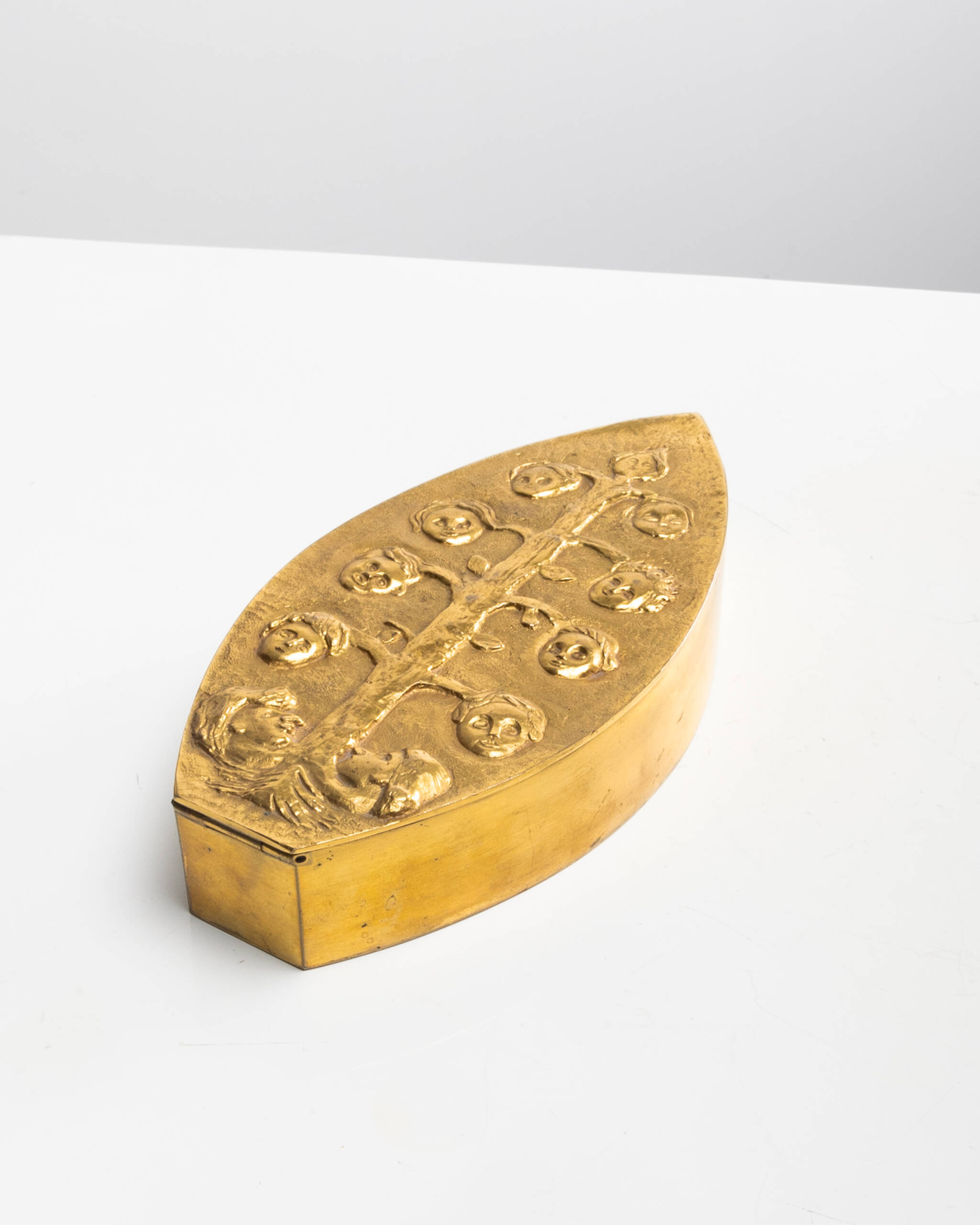 Gilded bronze box of almond shape, entirely sculpted in relief with a Tree of Life.