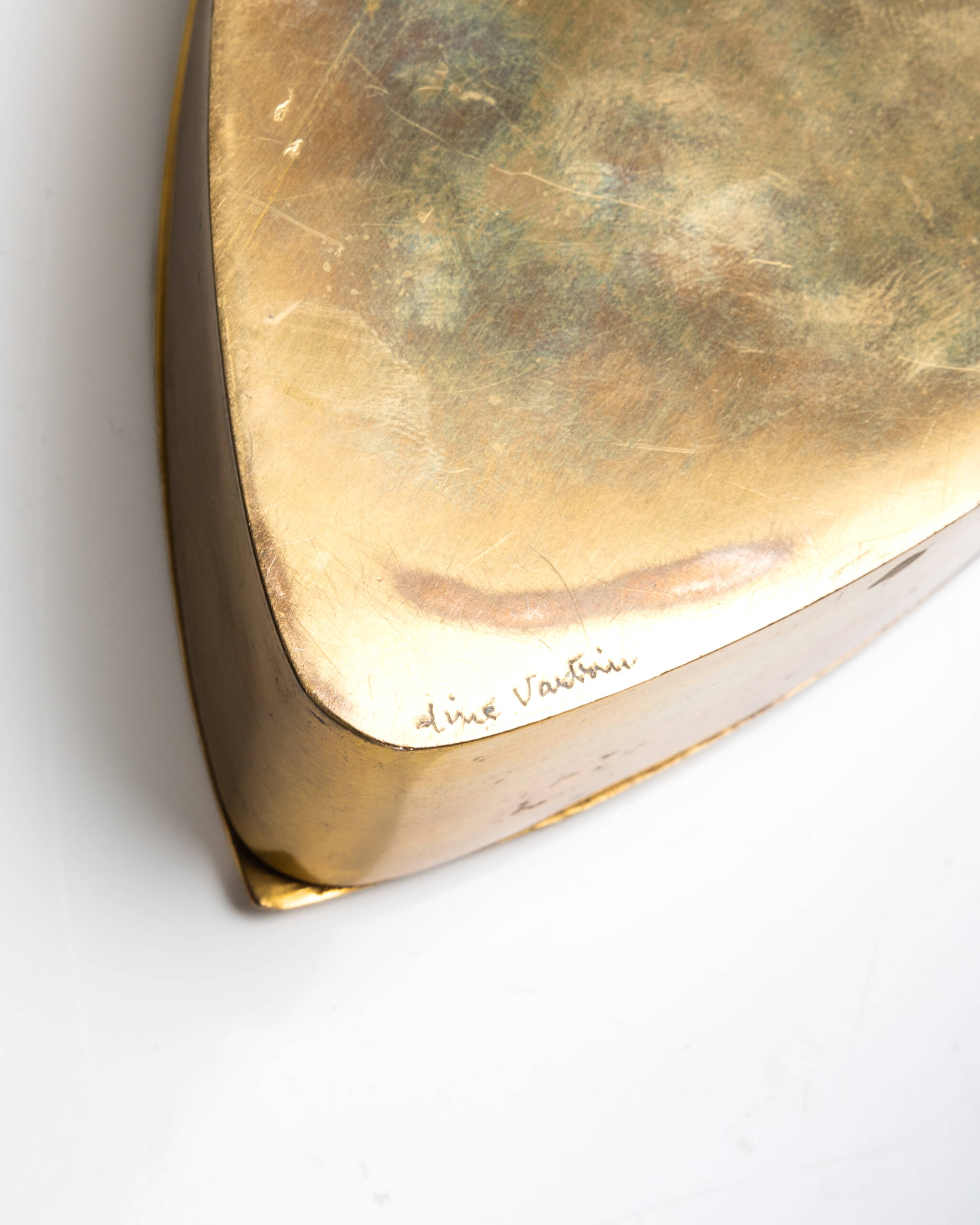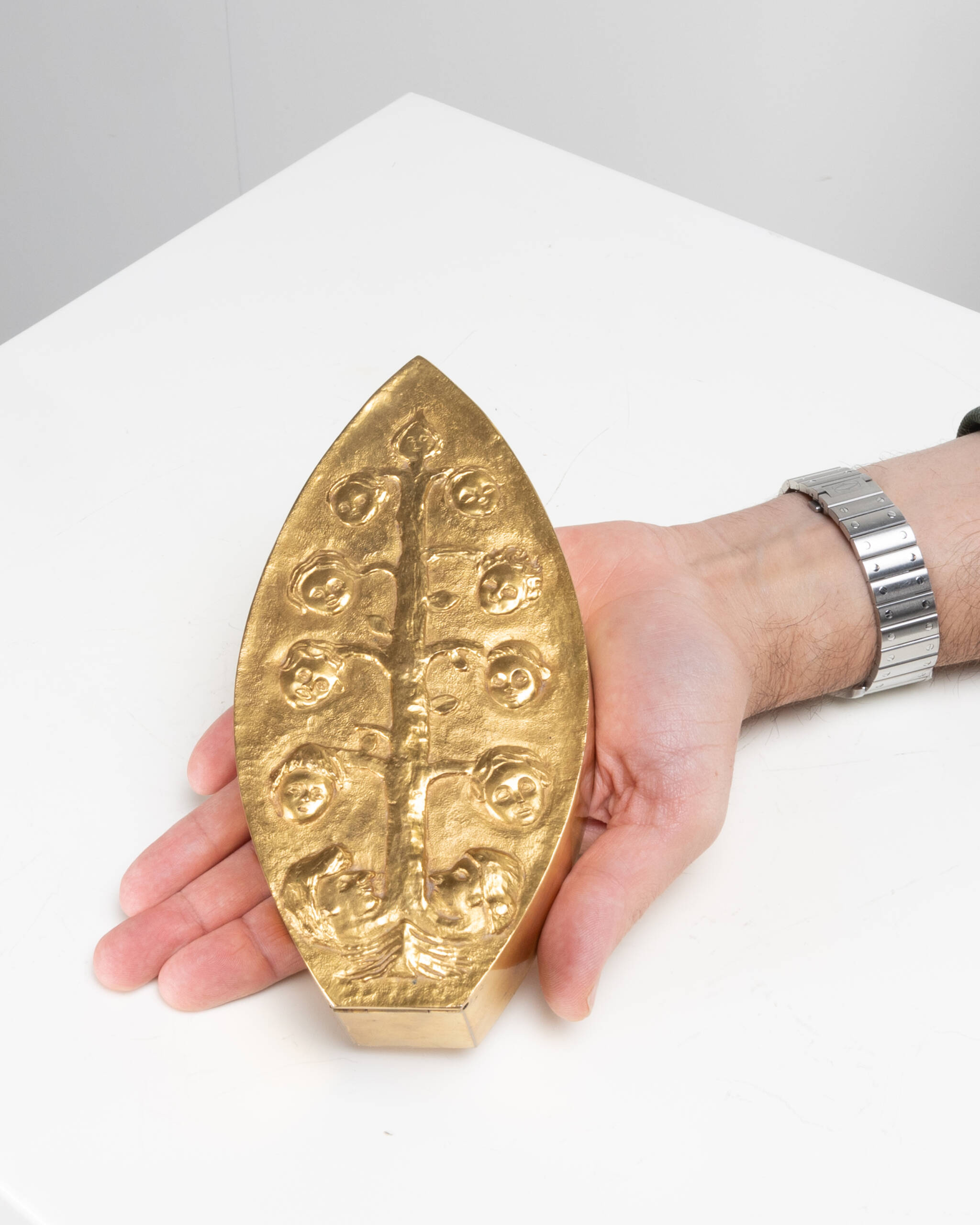 The vertical trunk expands into branches bearing small modelled faces, while at the base two human figures—representing the parents—appear to support or to bring the tree into being. This décor, at once archaic, poetic and symbolic, reflects Line Vautrin’s taste for allusive narratives and talismanic motifs in the years 1945–1955. The subtly hammered surface and vibrant modelling give the piece an almost votive presence, characteristic of her most expressive bronze castings.
