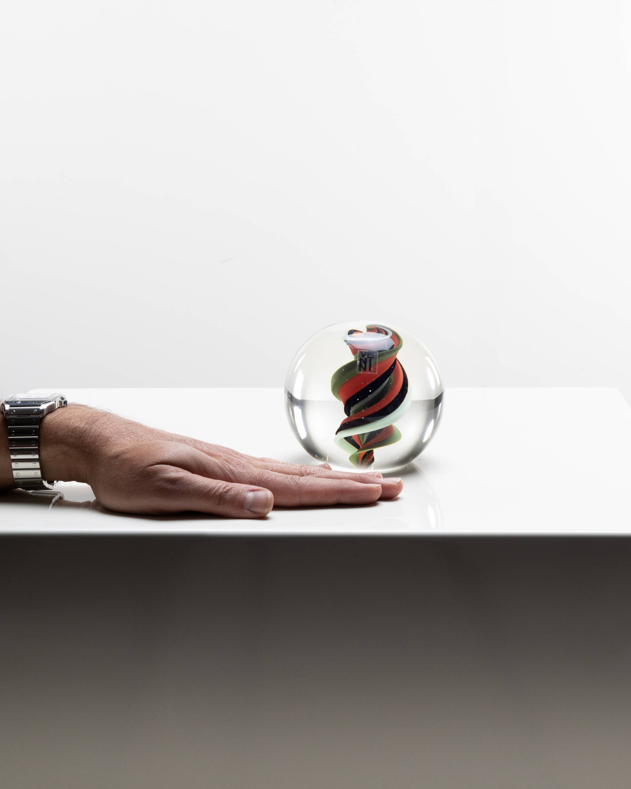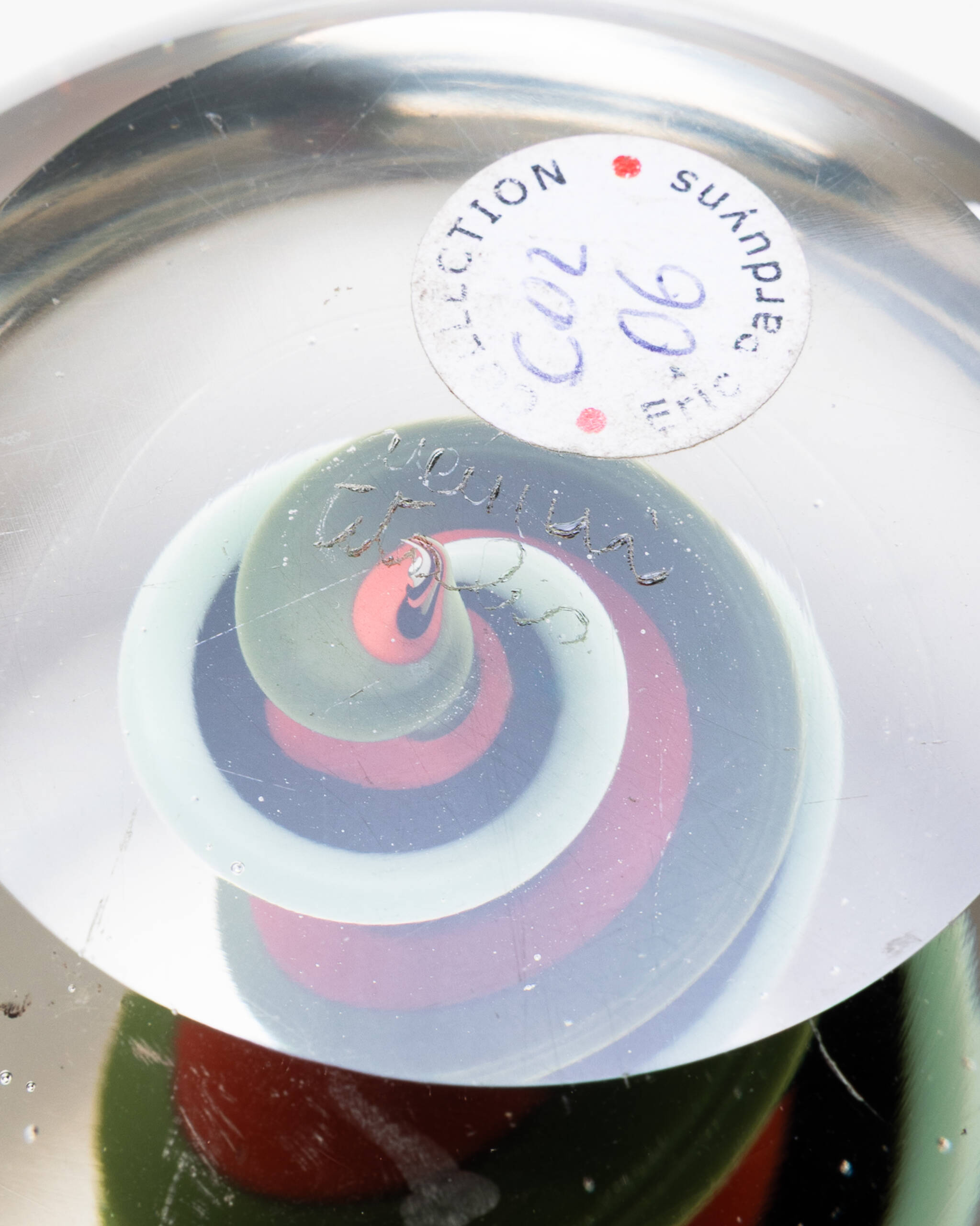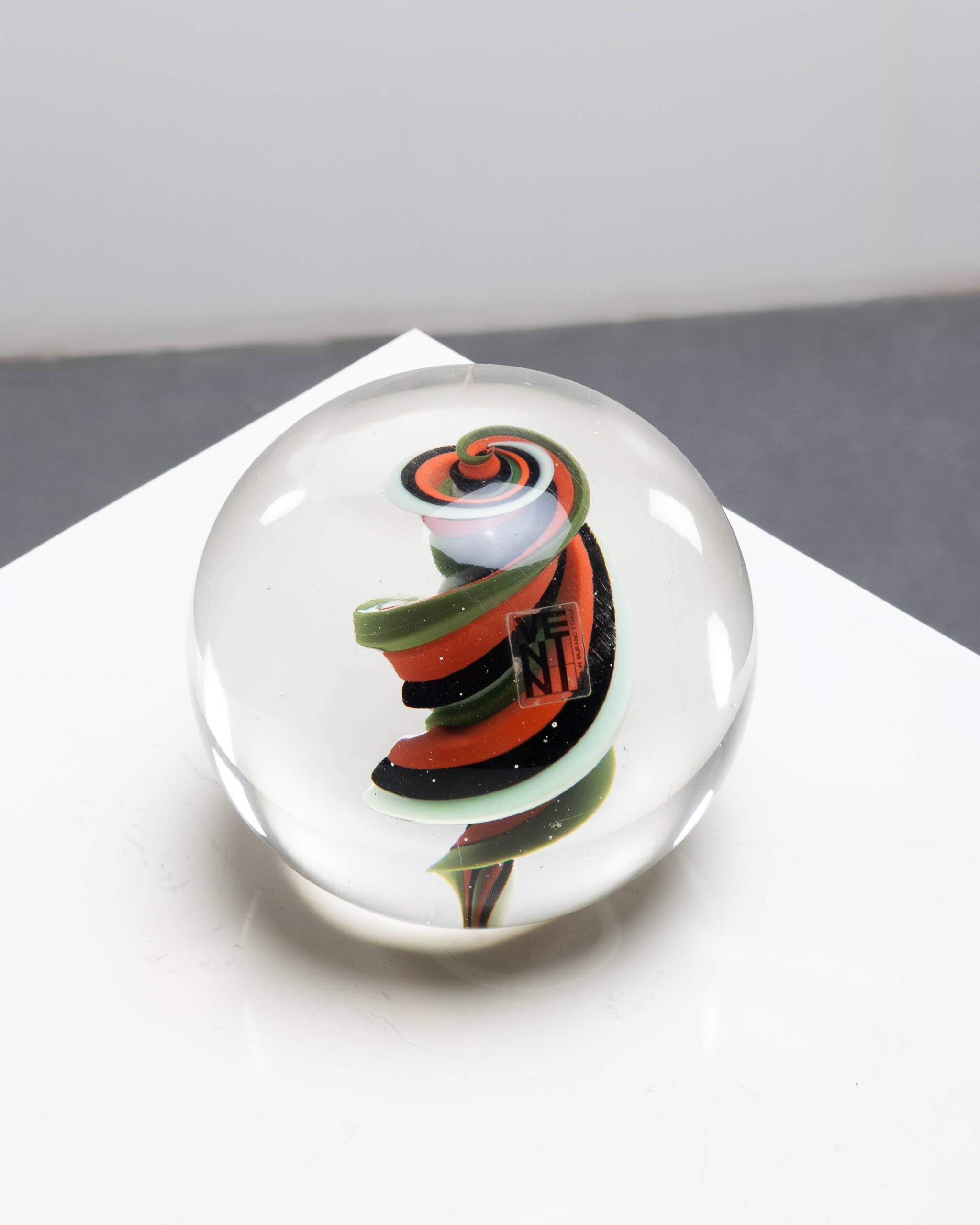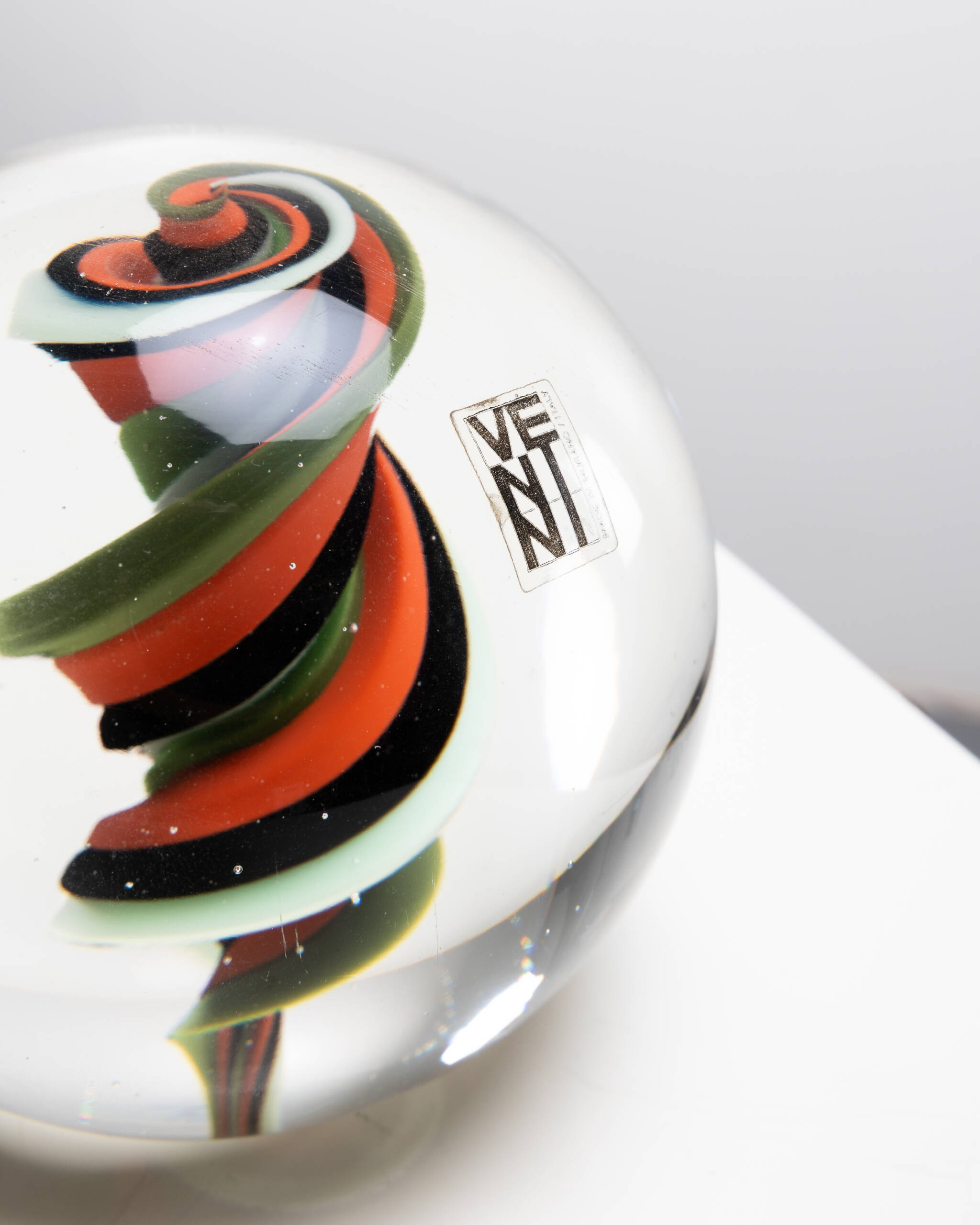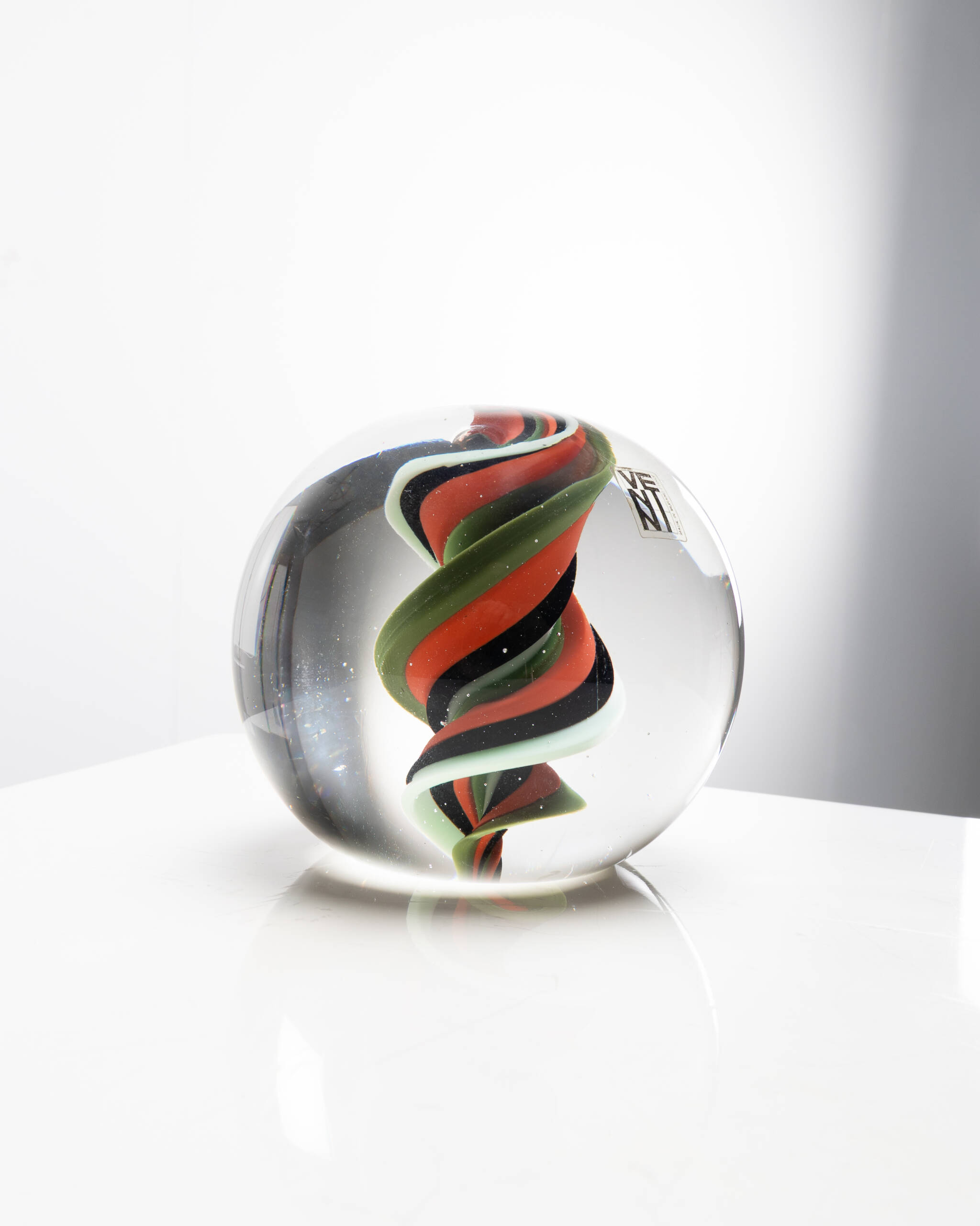 Large spherical paperweight with internal decoration of twisted multi-colored cane. (Green, sea green, orange and black).