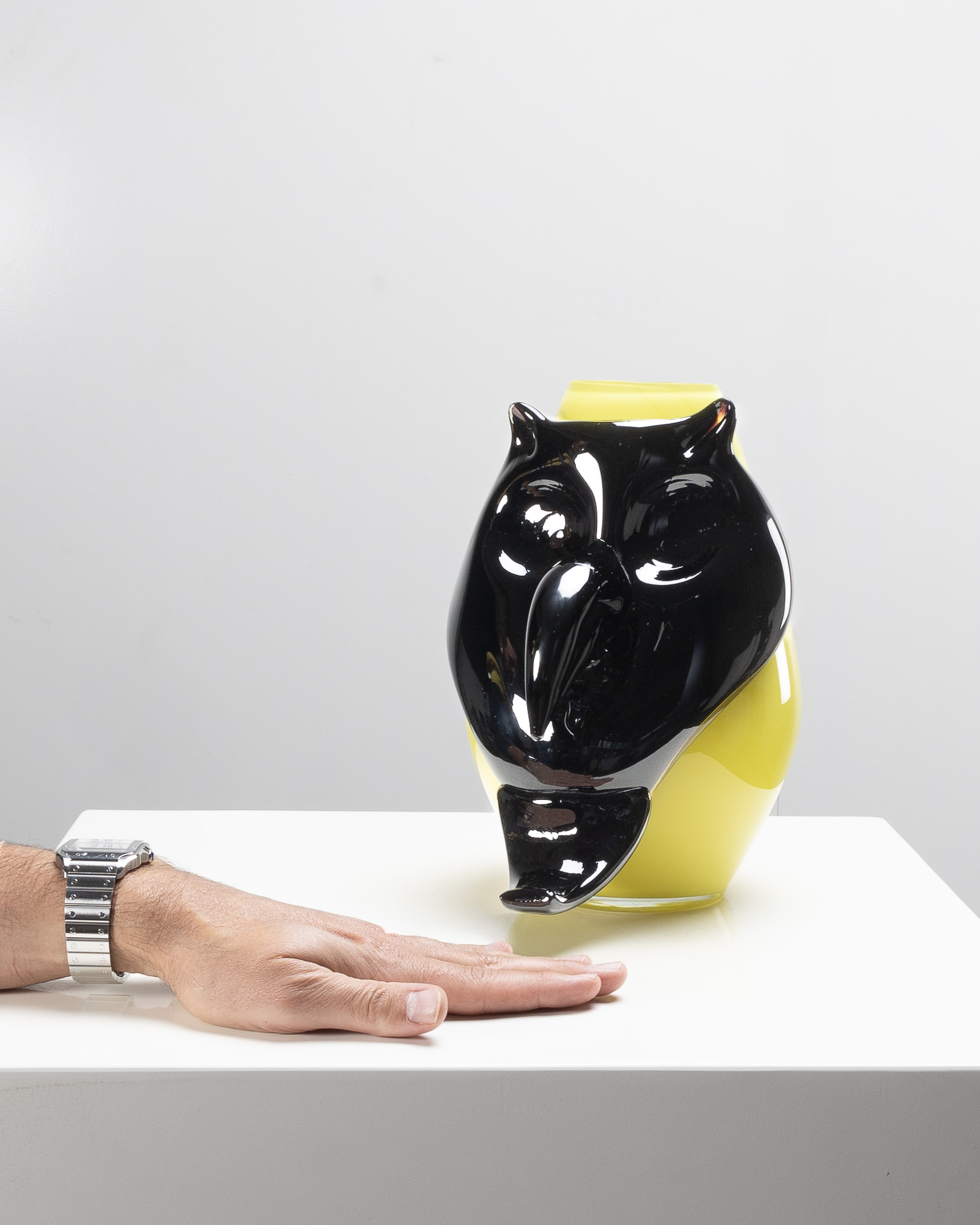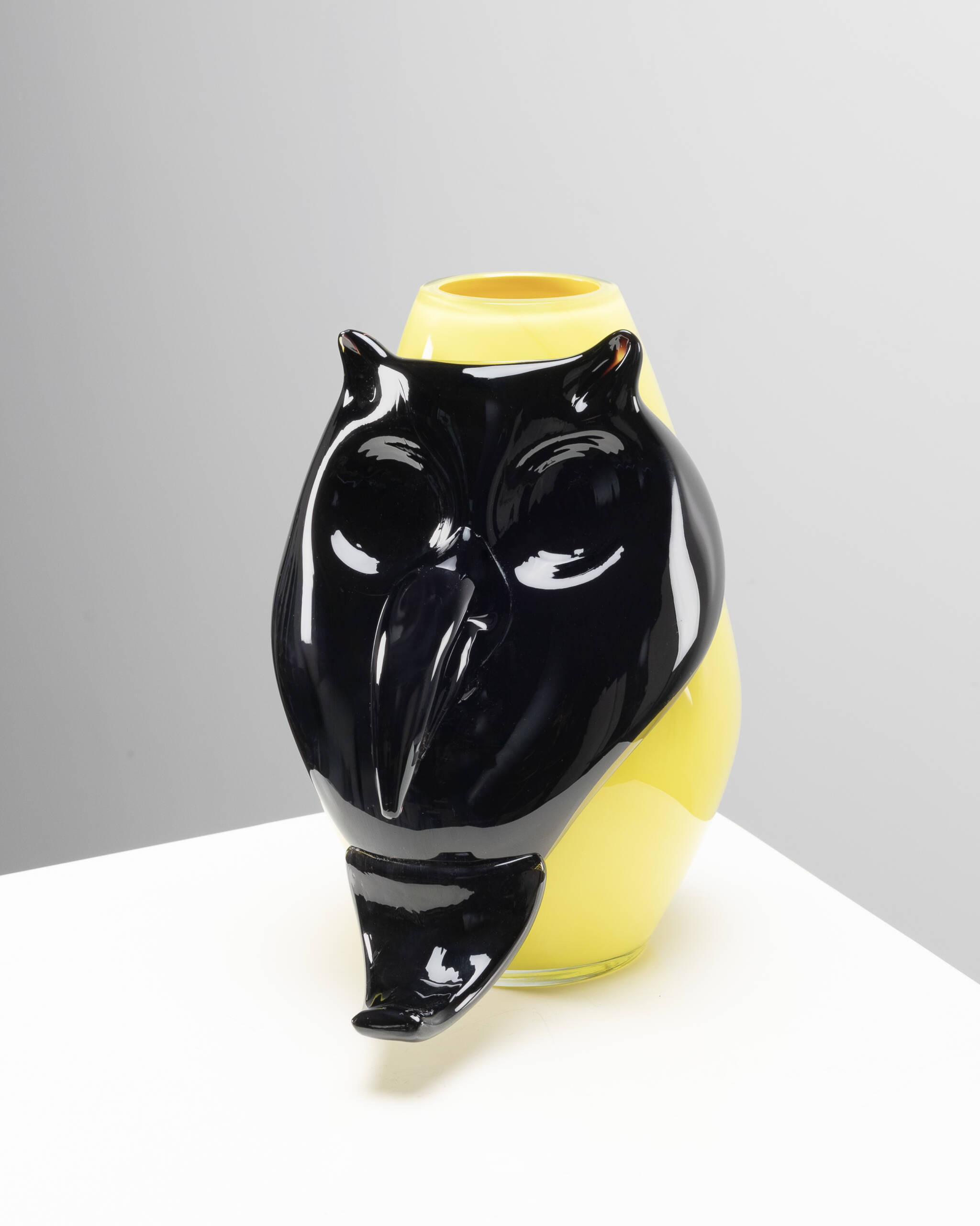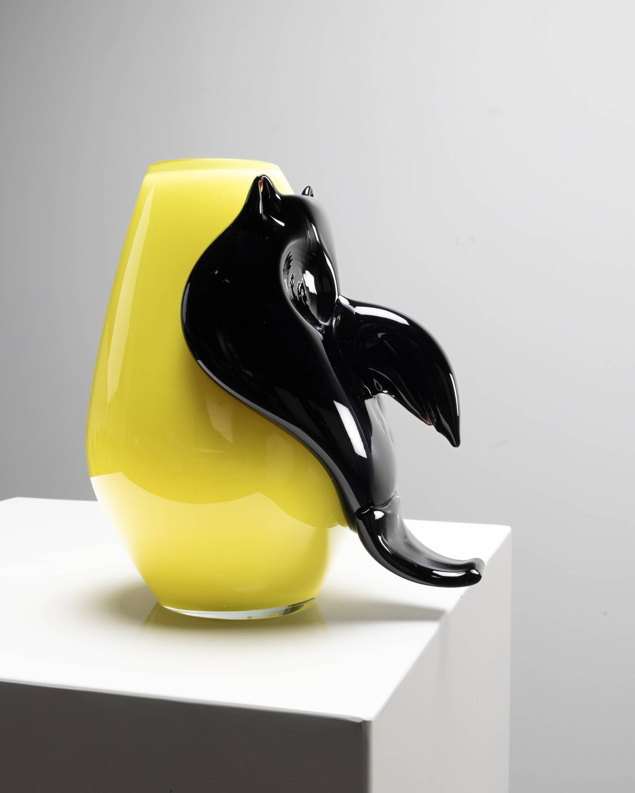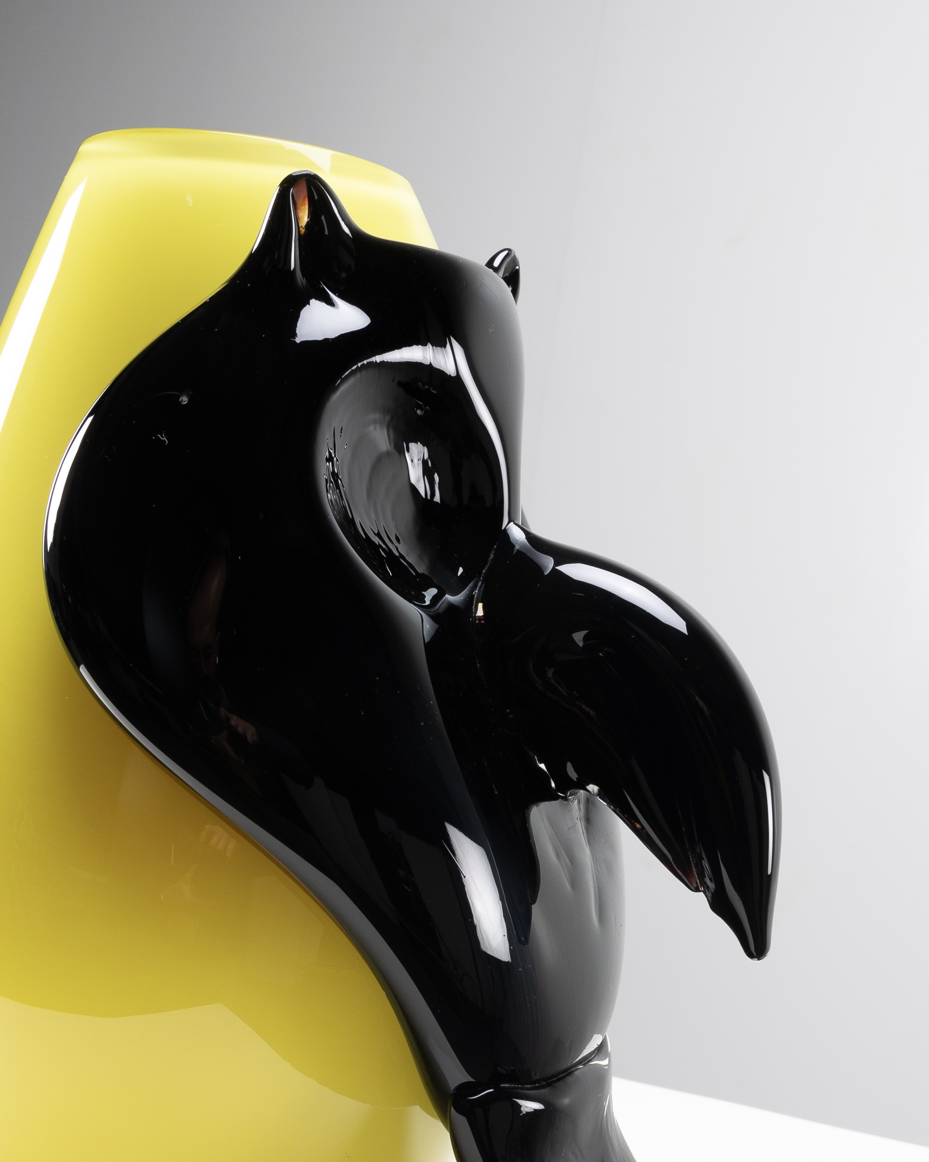 A sculptural figure in black glass is applied to its smooth, glossy body, forming a stylized mask with mysterious yet expressive features. The radical contrast between the luminous yellow and the deep black creates dramatic tension and highlights the work’s theatrical aspect.