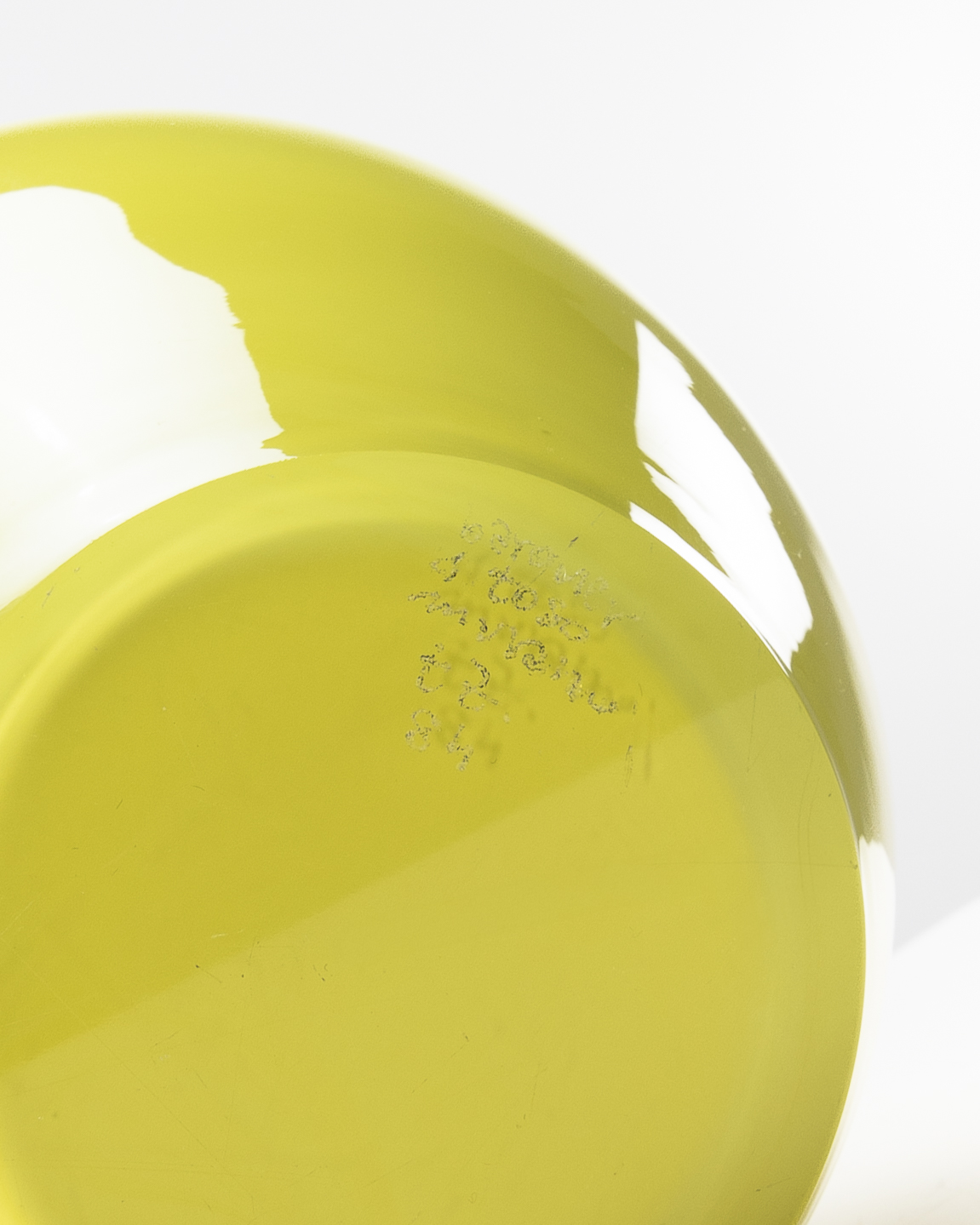 This vase features a sleek silhouette in blown glass, in a vibrant yellow that immediately captures the eye.