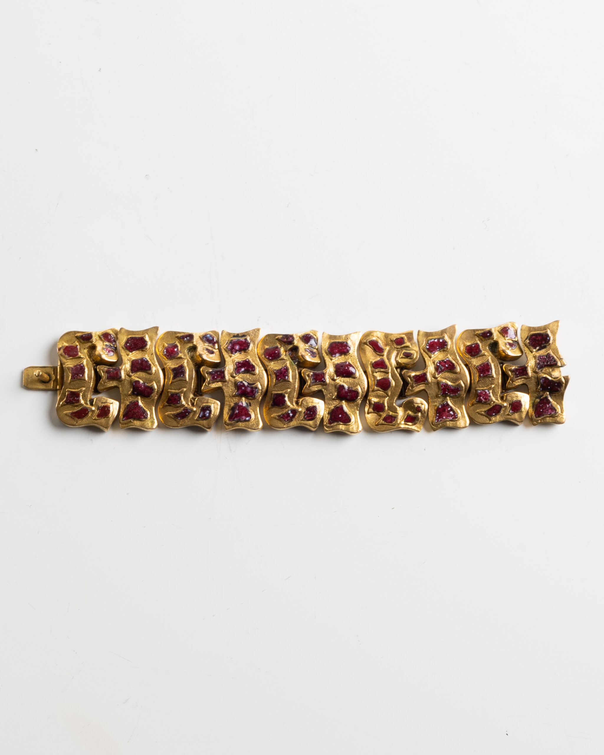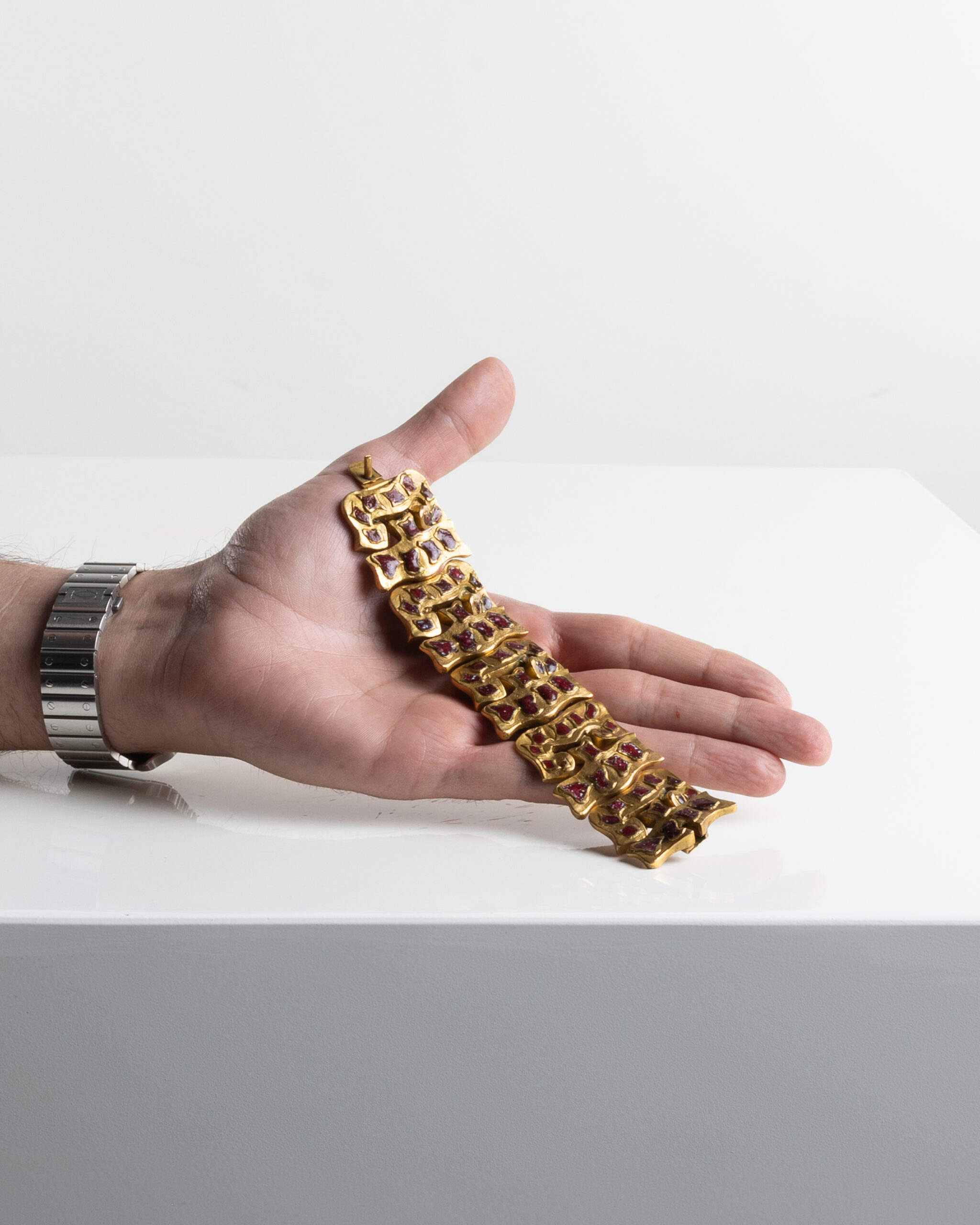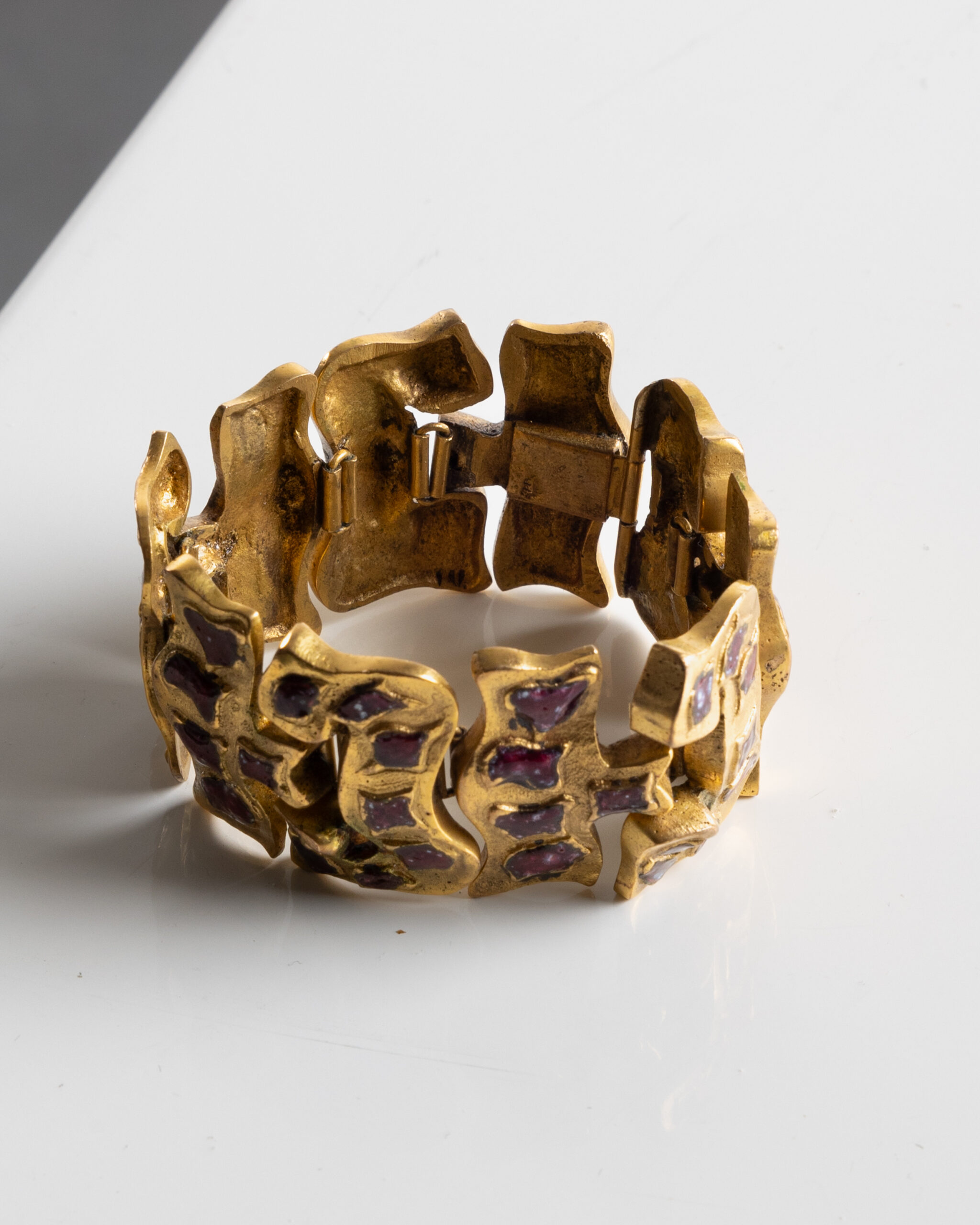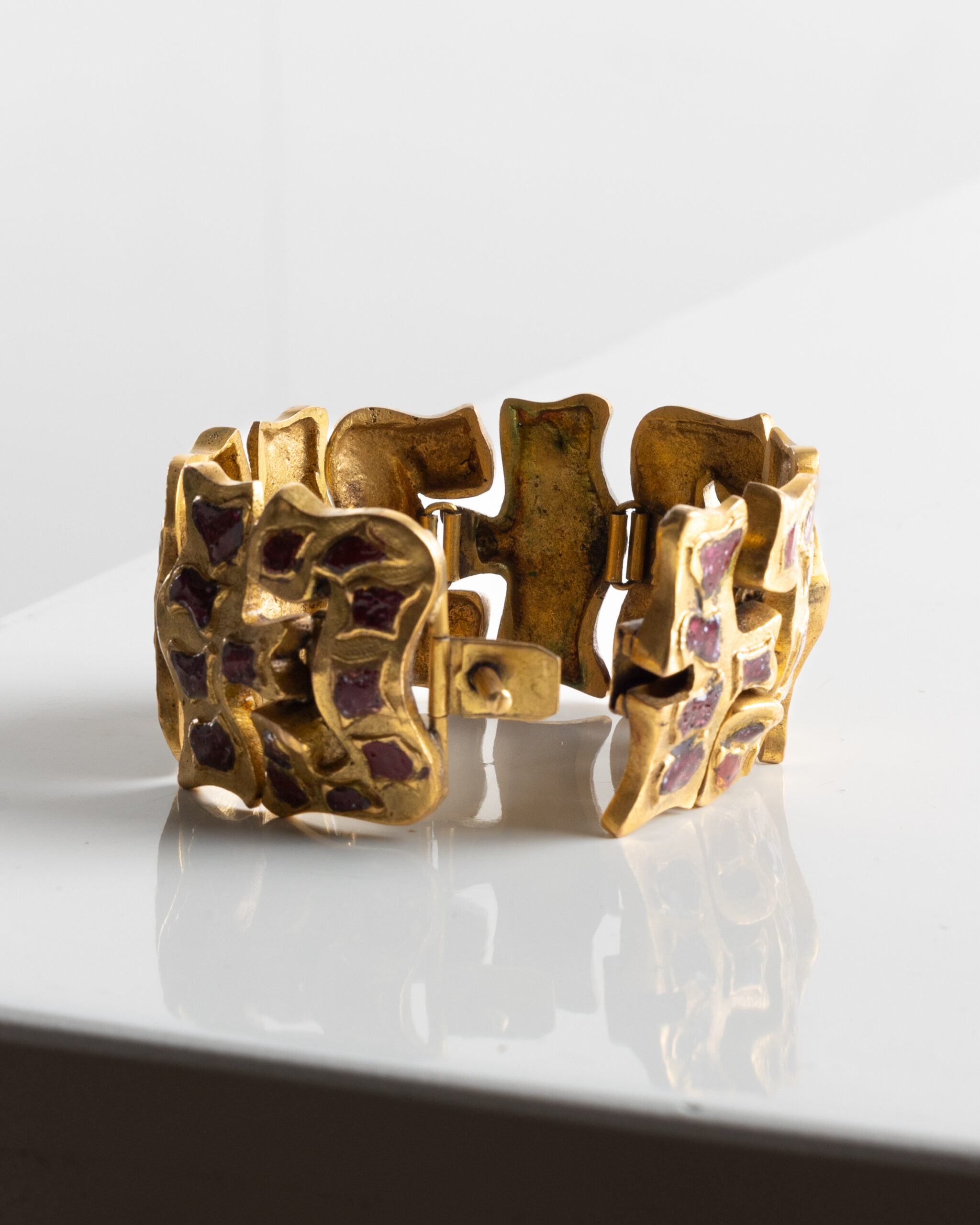 Articulated bracelet in gilt bronze, composed of interlocking geometric modules forming the so-called “Puzzle” motif. The surfaces, sculpted in slight relief, are enhanced with kiln-fired ruby-red enamel applied within irregular cells.