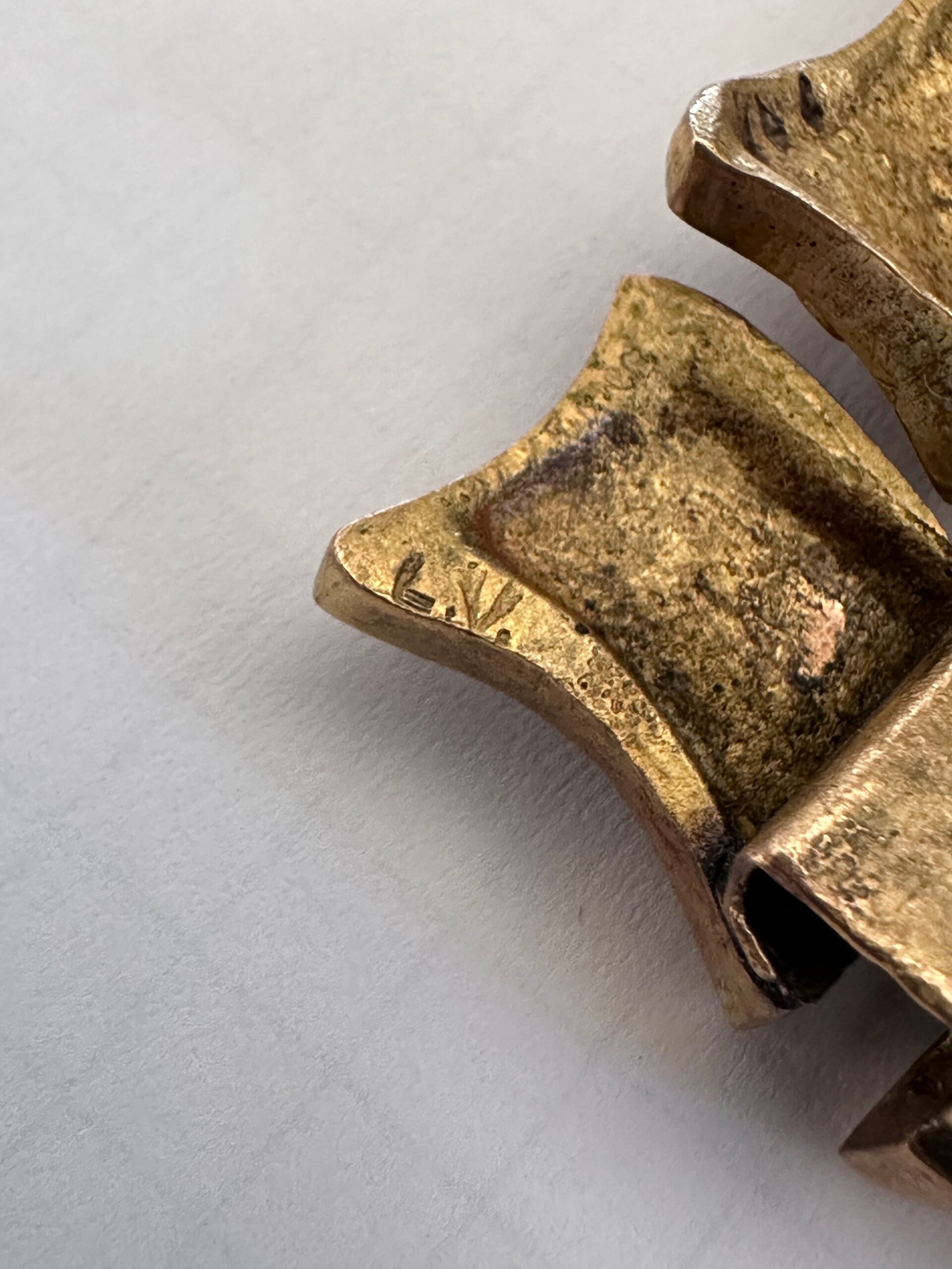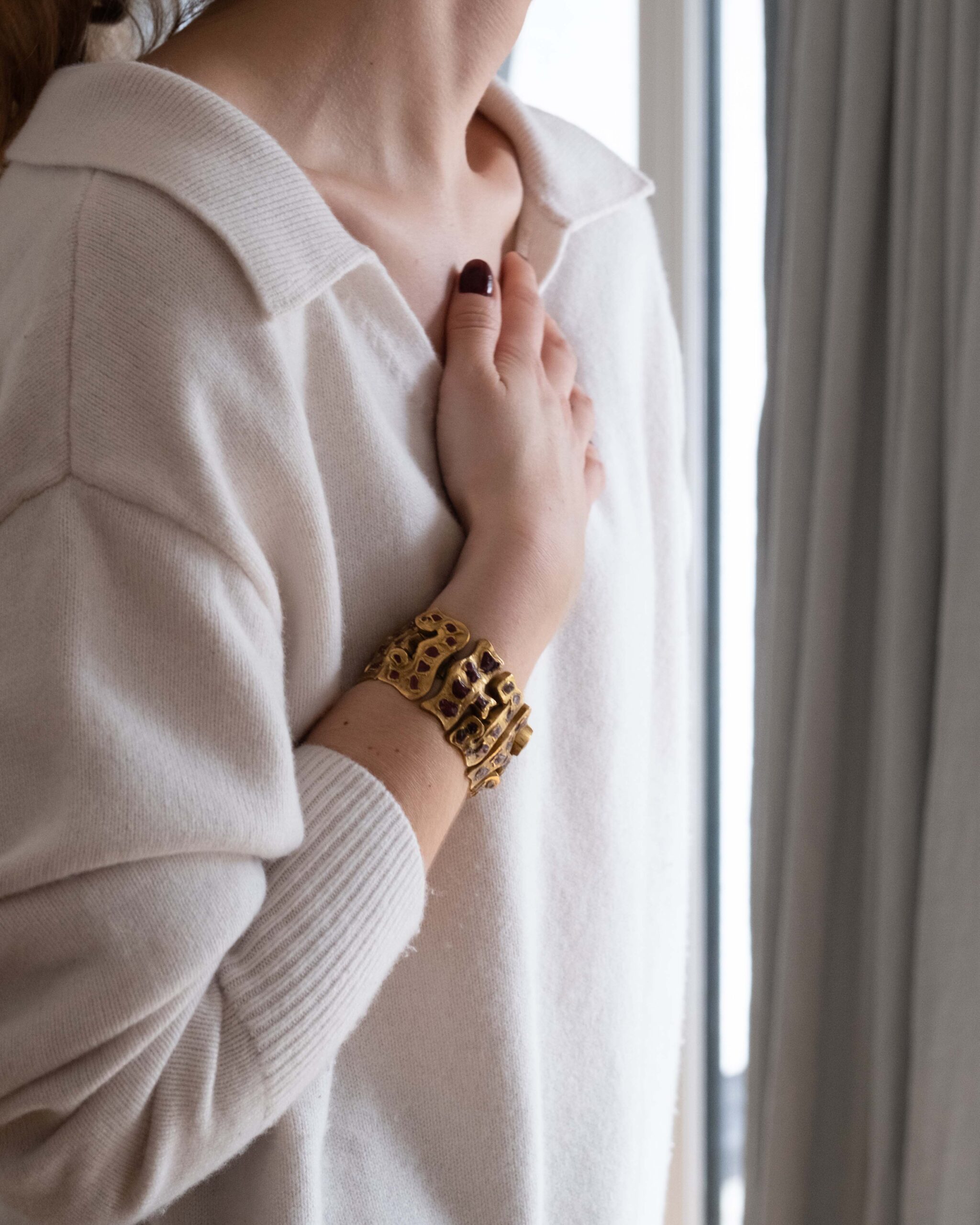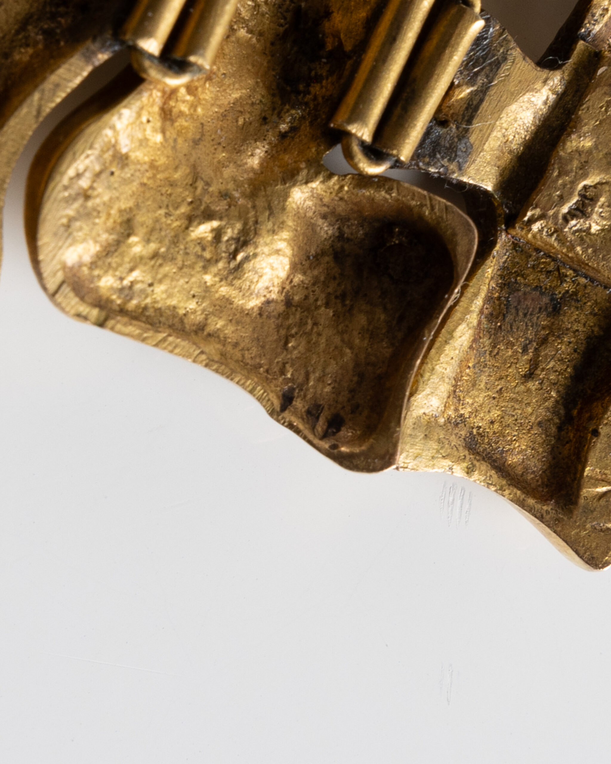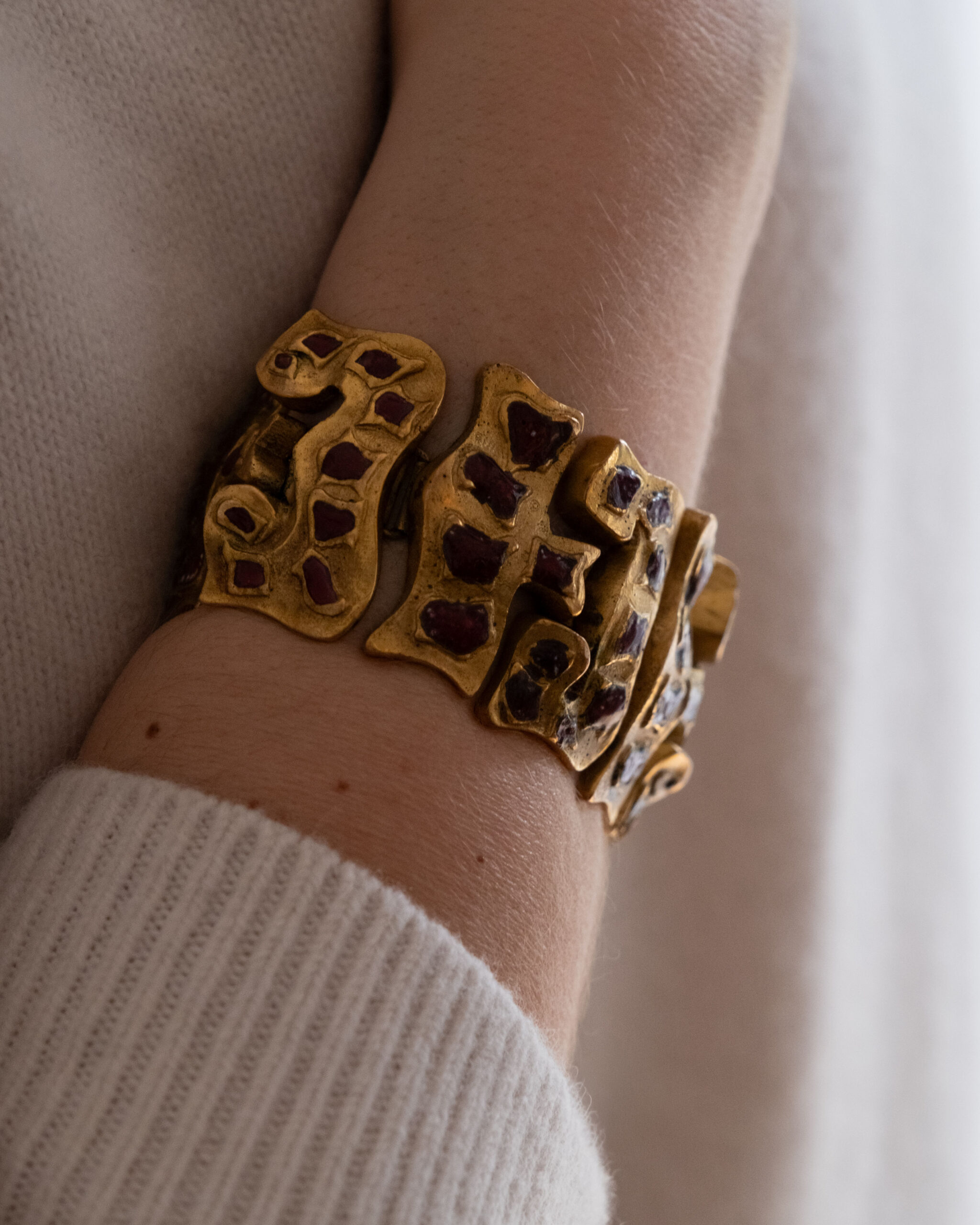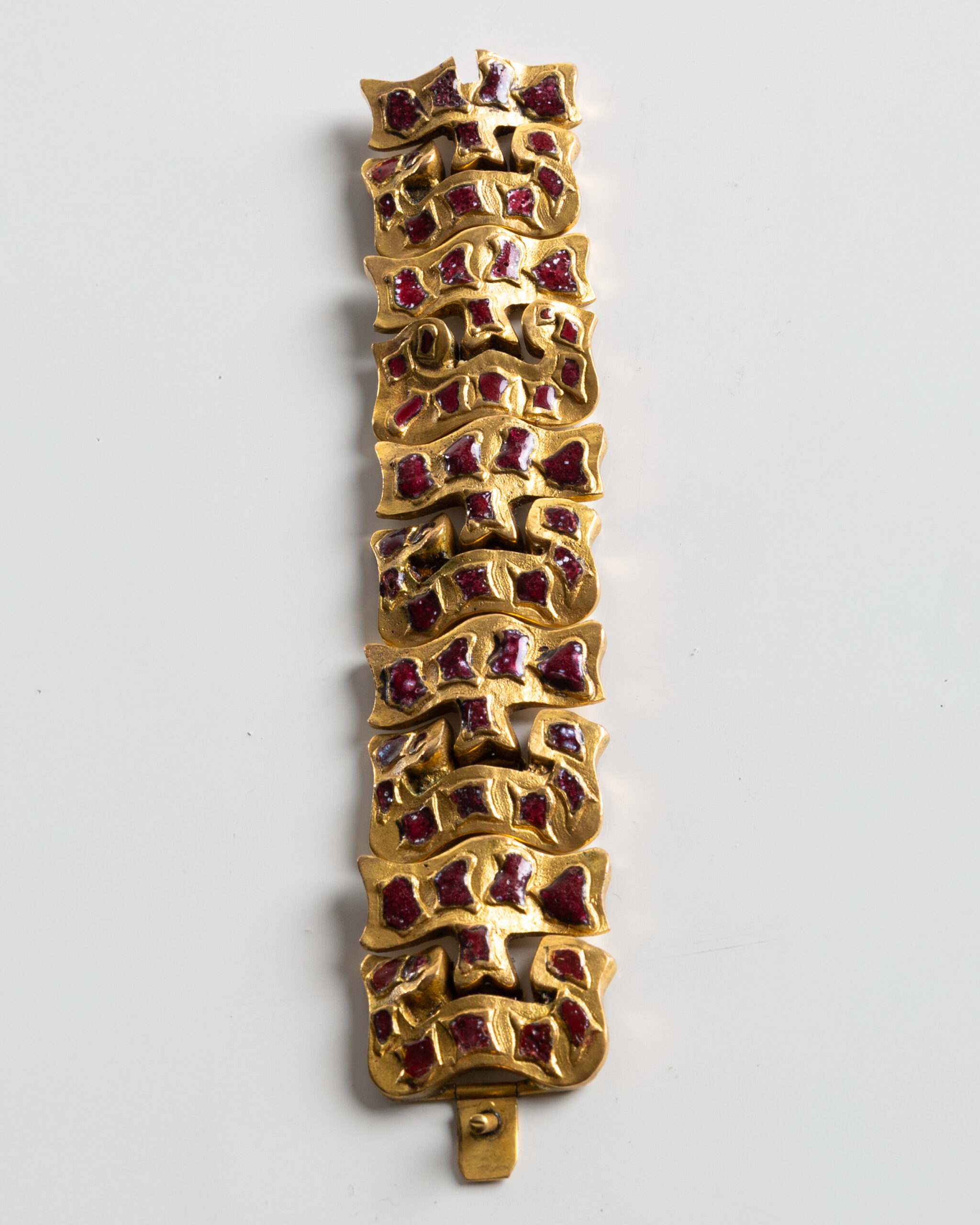 Articulated bracelet in gilt bronze, composed of interlocking geometric modules forming the so-called “Puzzle” motif. The surfaces, sculpted in slight relief, are enhanced with kiln-fired ruby-red enamel applied within irregular cells.