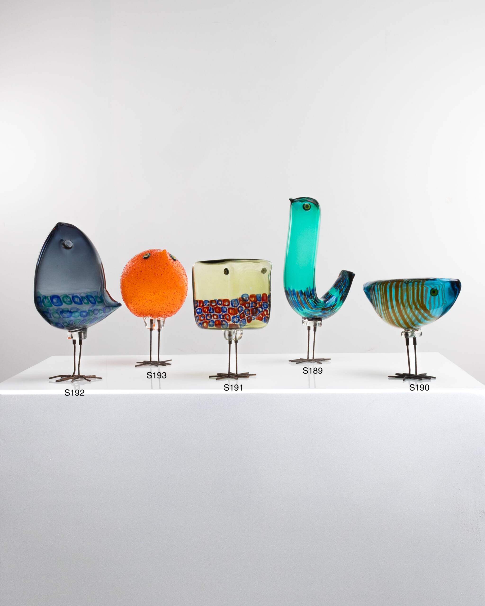 The last bird (far right) has a cubic shape. Its olive-green body is decorated with blue and red murrines, and the eyes are made of two hot-applied murrines.