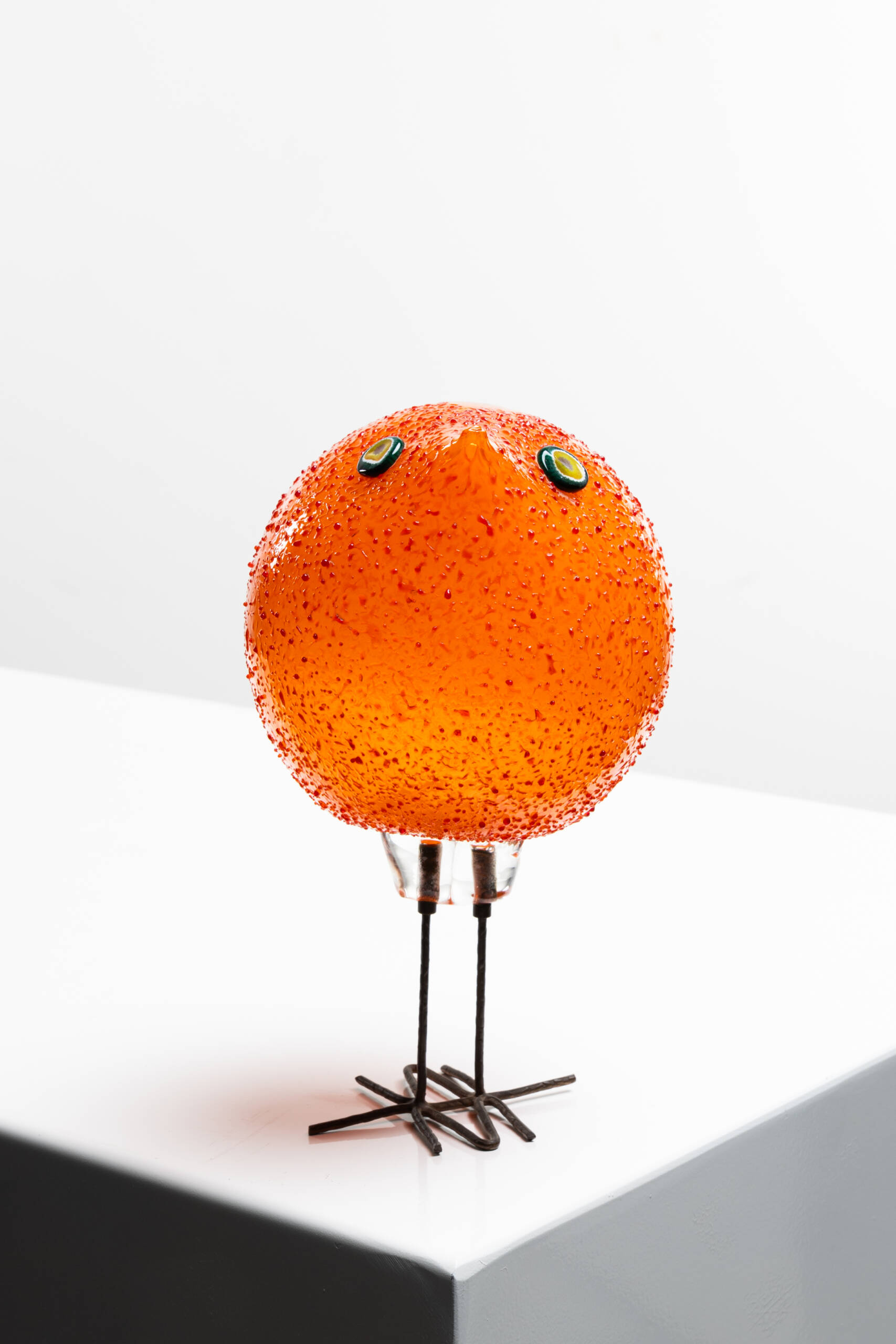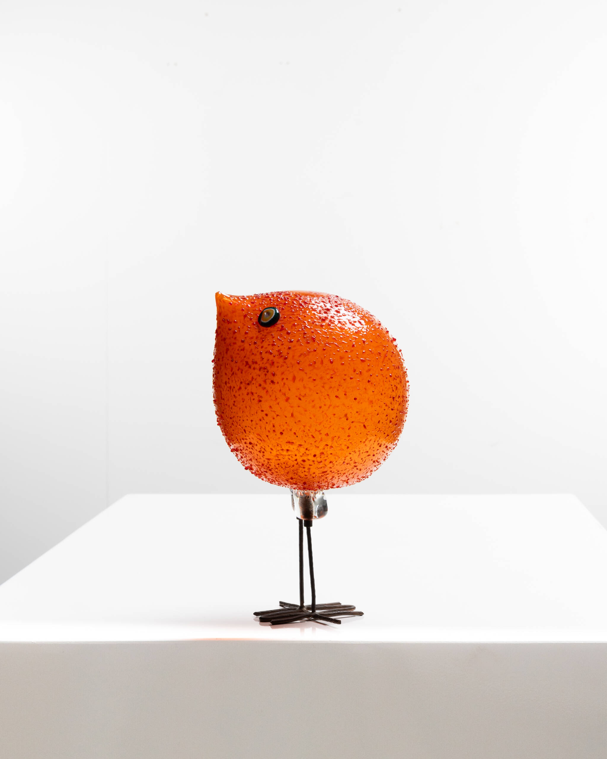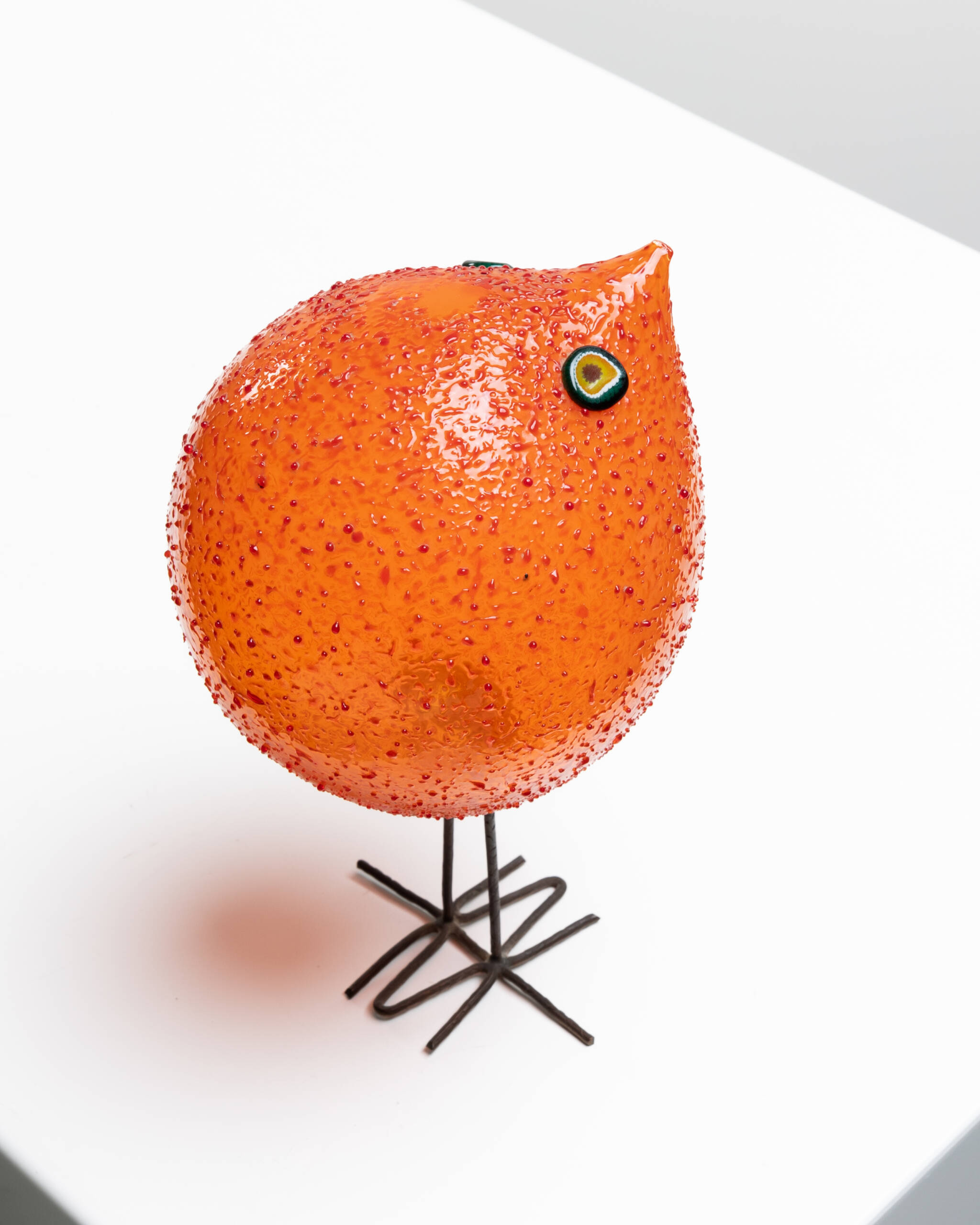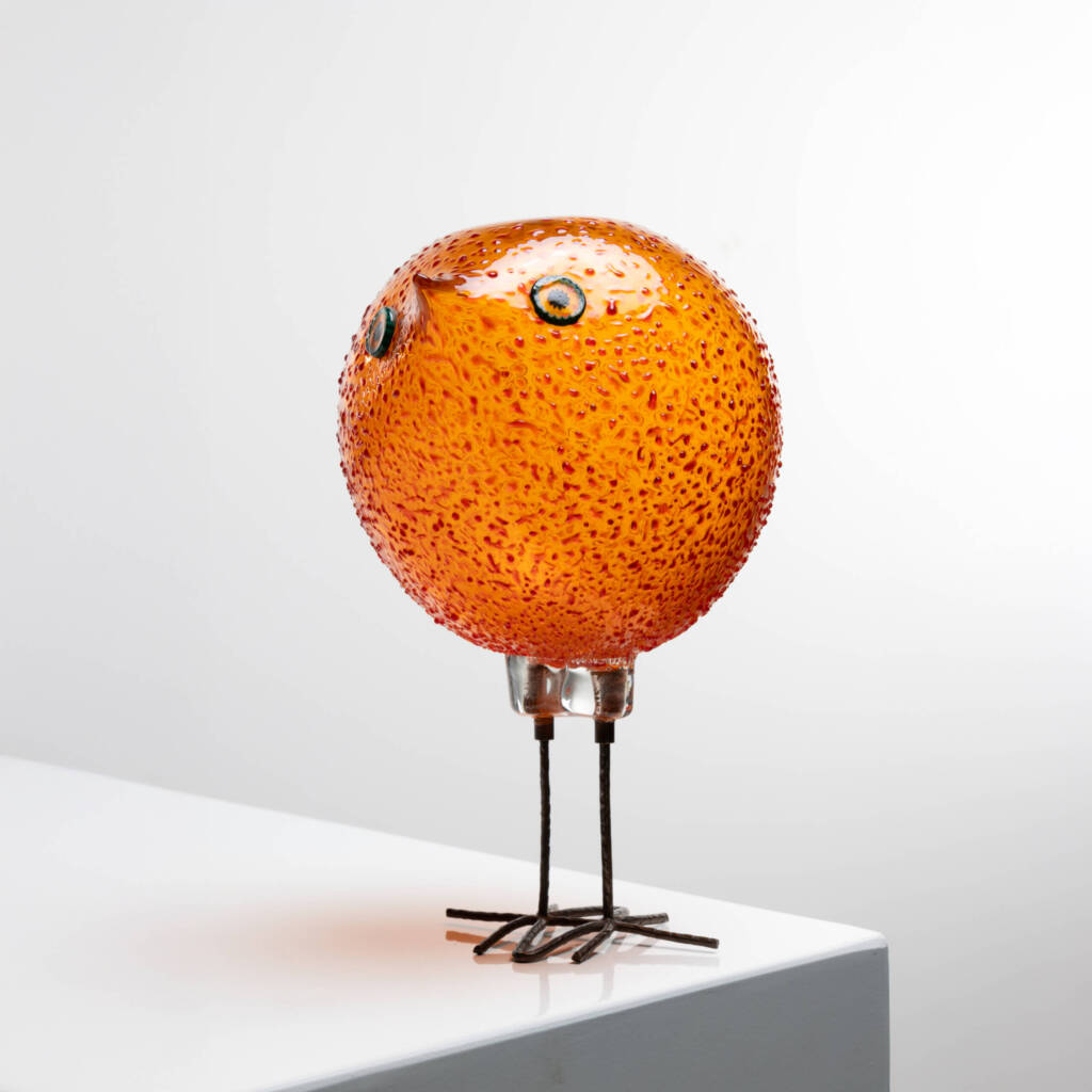 The fourth bird is the one that achieved the greatest commercial success. Its body is composed of an orange glass sphere with an uncommon textured surface that imitates feathers. Two hot-applied murrines form the eyes.
