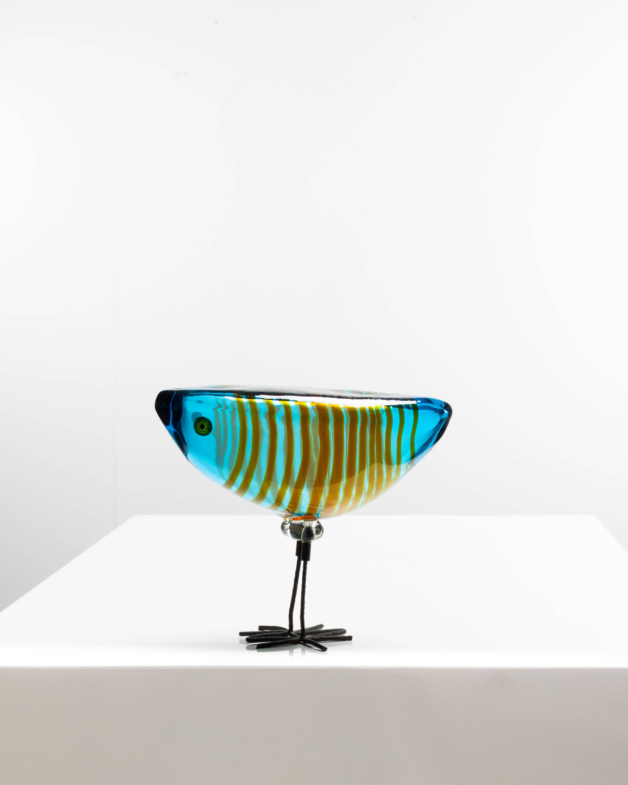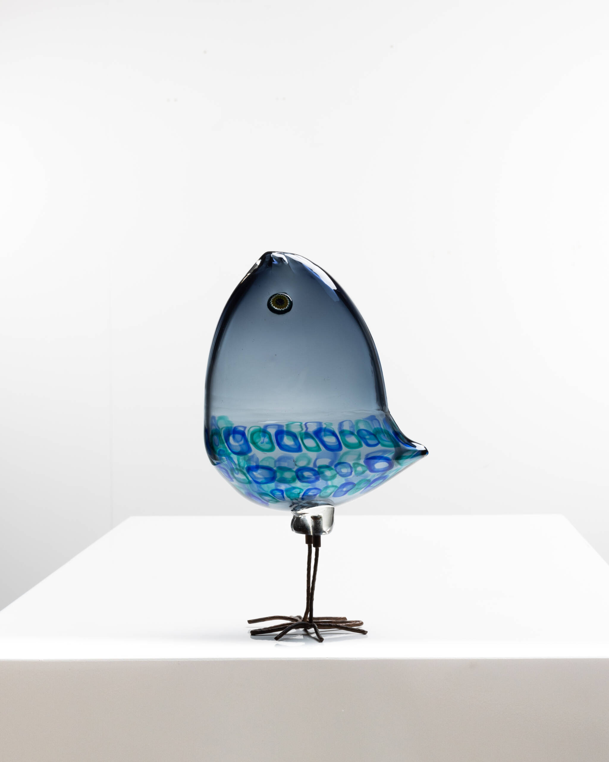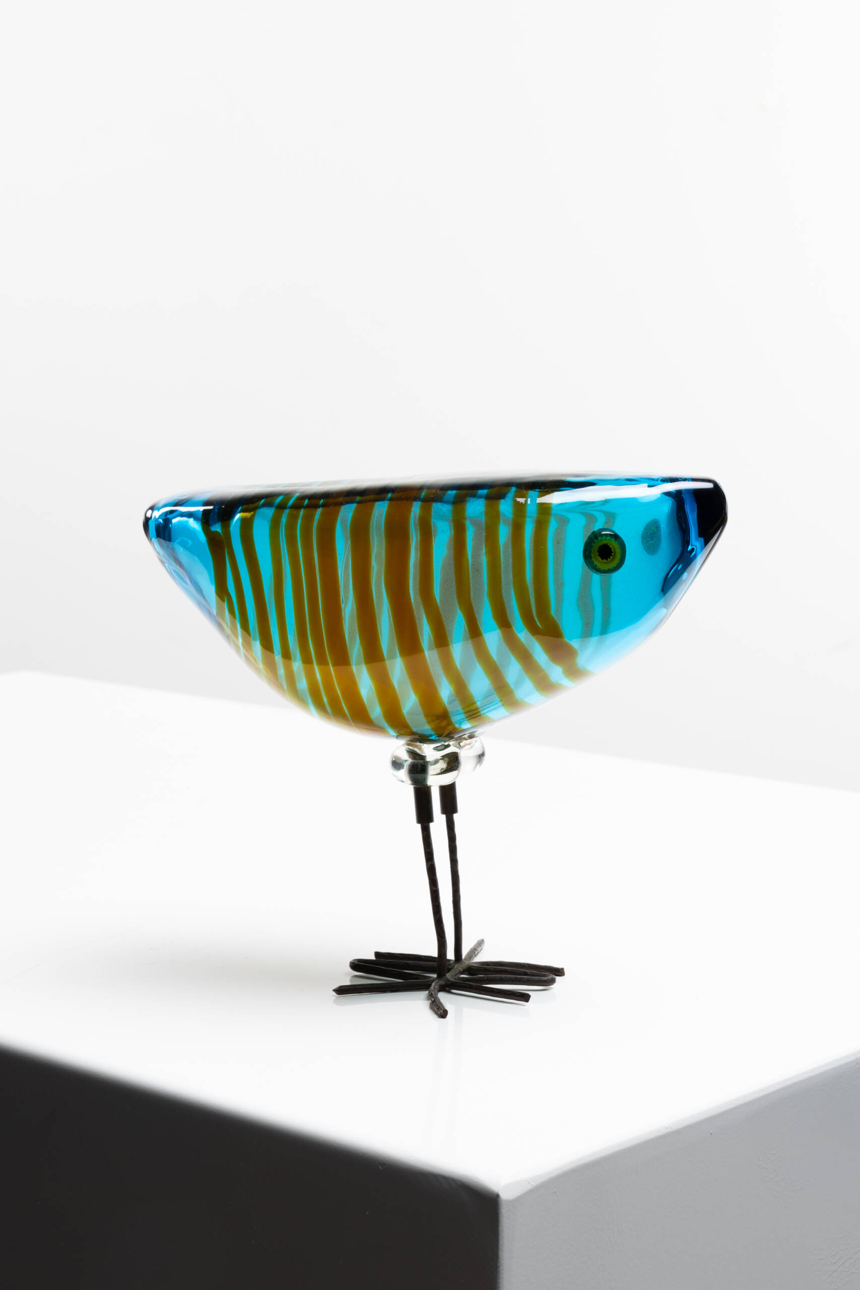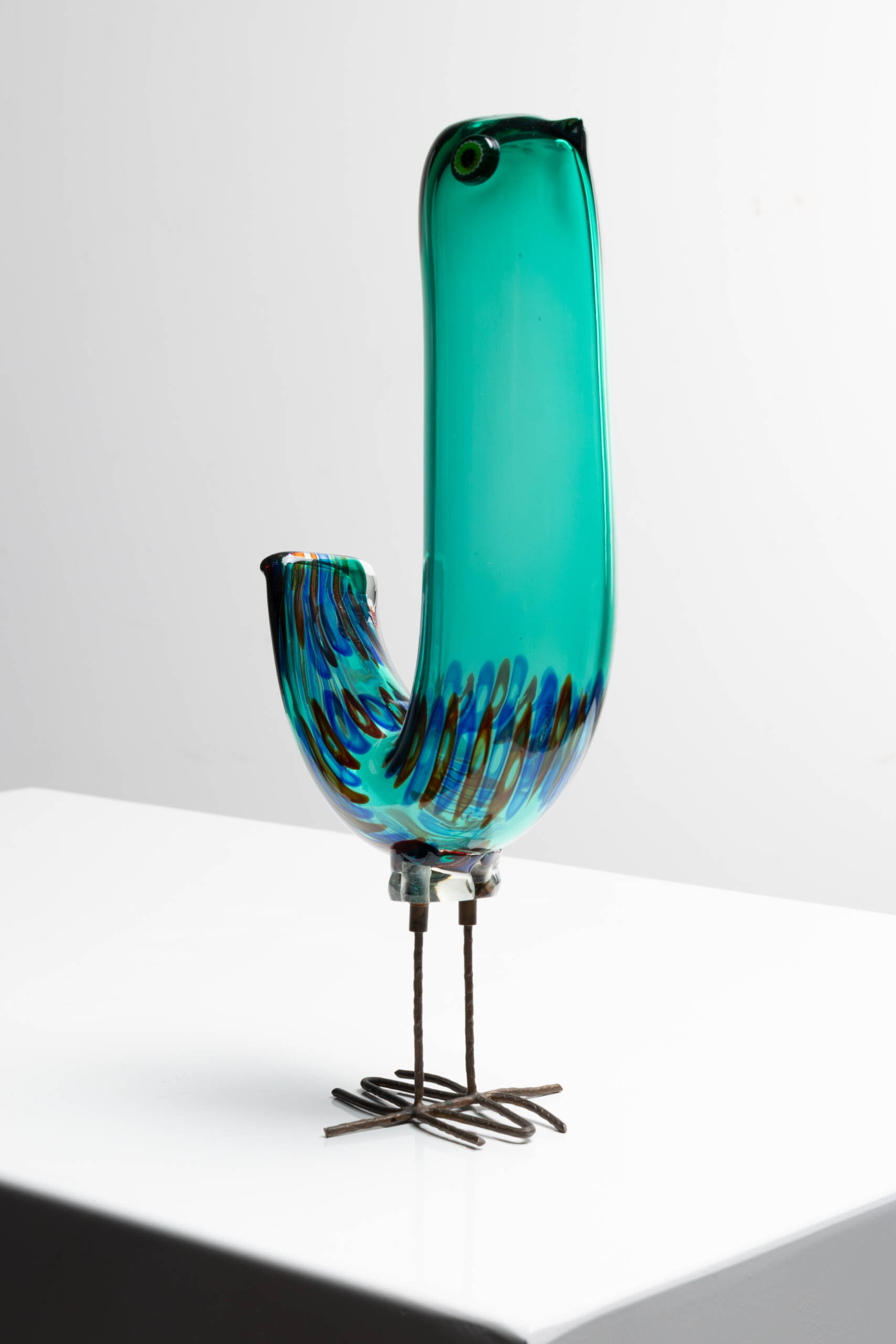 The fourth bird is the one that achieved the greatest commercial success. Its body is composed of an orange glass sphere with an uncommon textured surface that imitates feathers. Two hot-applied murrines form the eyes.