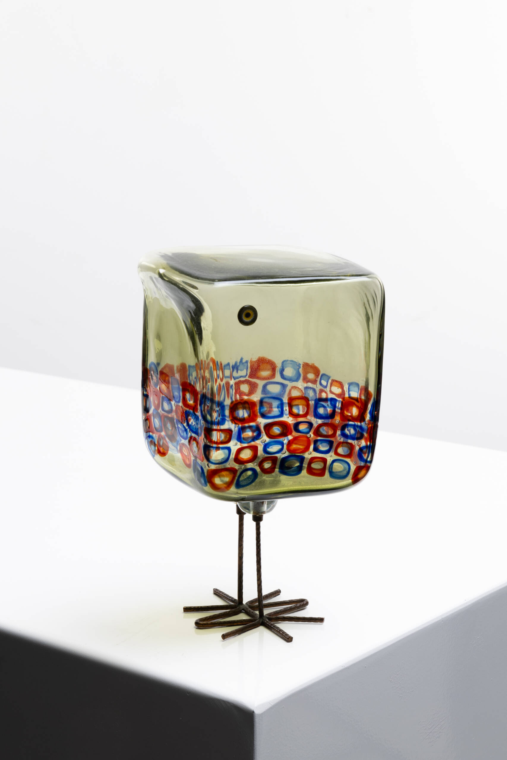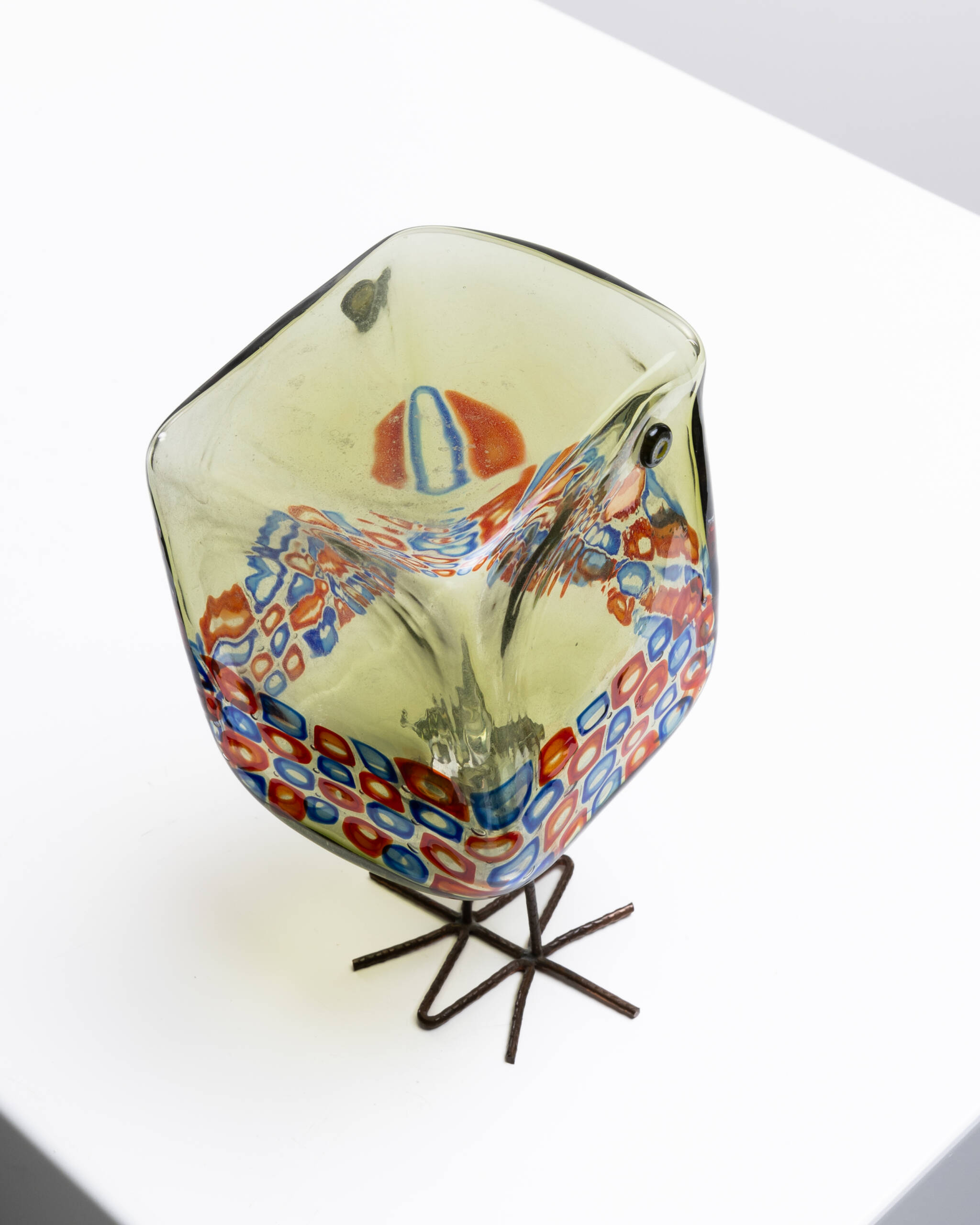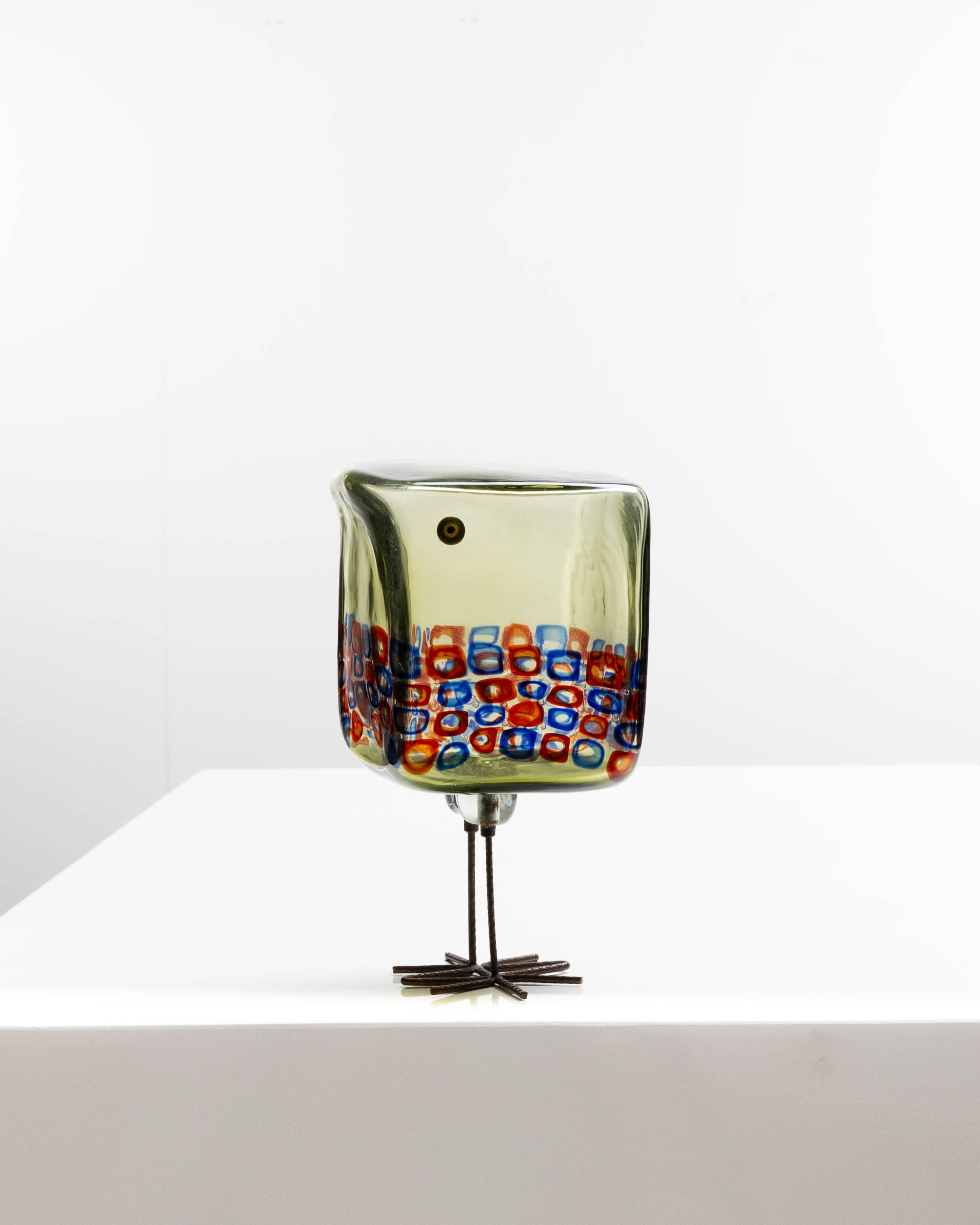Its body is decorated with green and blue square-shaped murrines, which are alternately arranged. The eyes are made of hot-applied murrines.