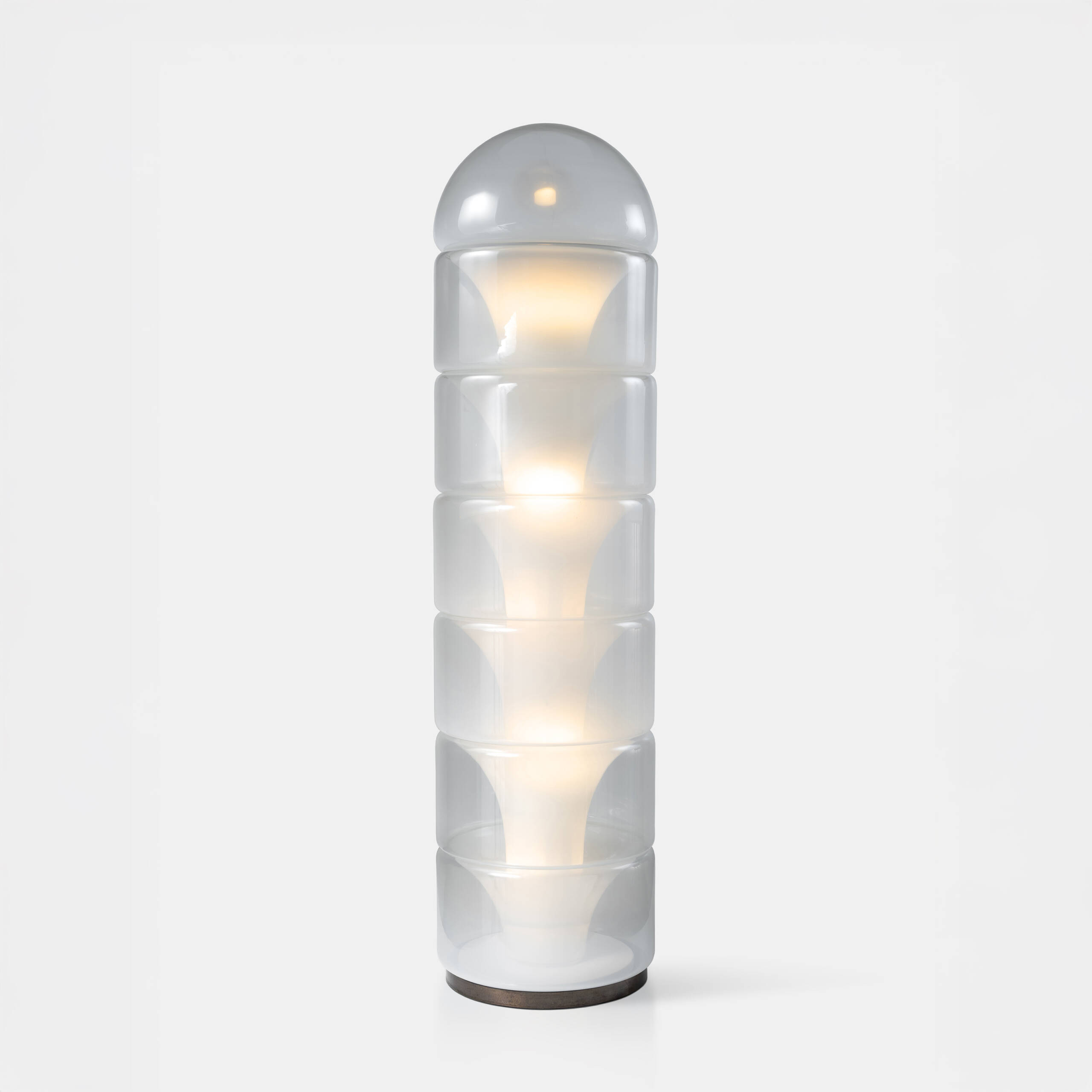 Floor lamp by Carlo Nason for Mazzega, composed of a column of seven hand-blown glass modules alternating between clear and opaline finishes. Each segment, shaped using the sfumato technique, creates a softly graduated diffusion that gives the light a gentle and enveloping quality. Topped with a hemispherical dome, this sculptural lamp perfectly embodies Nason’s aesthetic: pure forms, architectural volumes, and a masterful command of Murano glass.