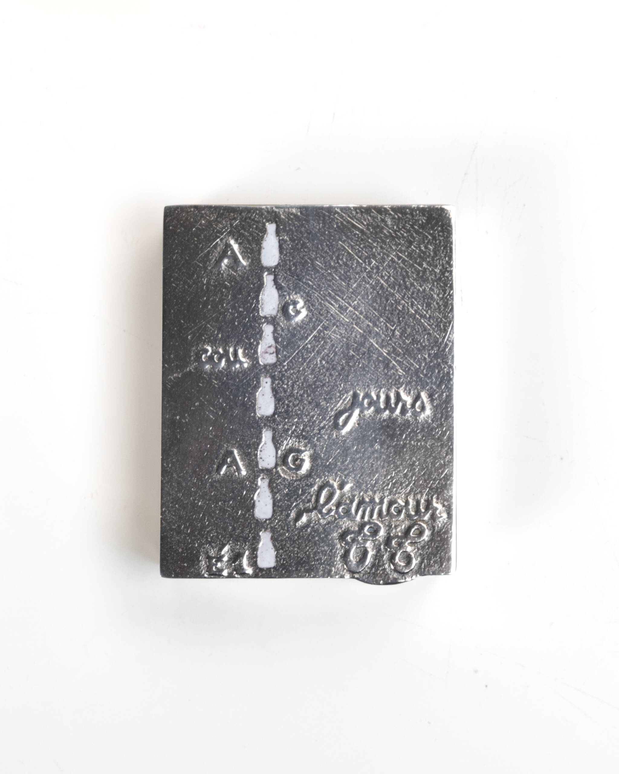La surface, finement striée, est animée d’un dispositif graphique combinant lettres isolées, mots gravés et une succession verticale de petits flacons stylisés, évoquant le lait. Cette composition, pensée pour être déchiffrée phonétiquement, révèle une phrase complète :