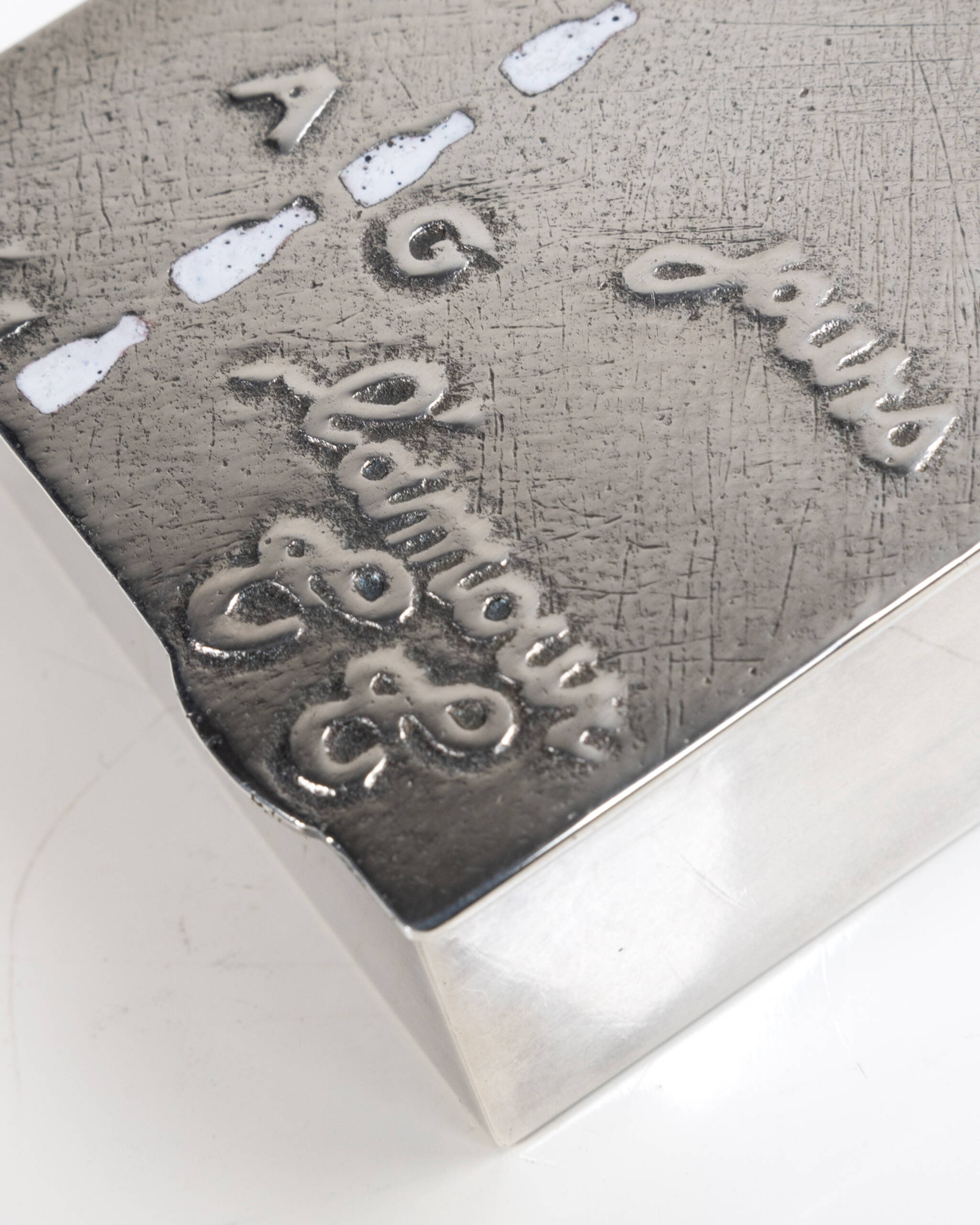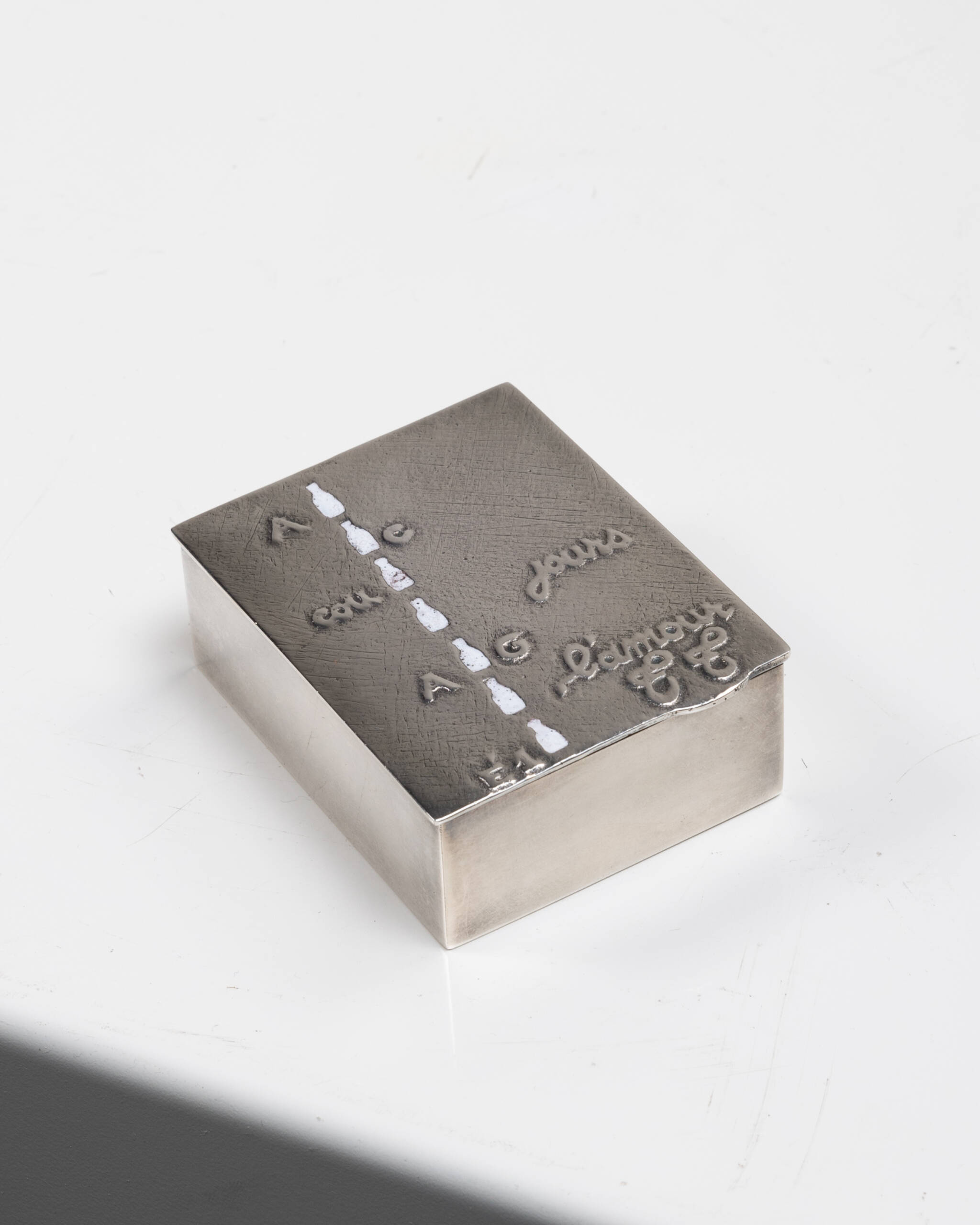 « Allez laissez couler les jours », boîte en bronze argenté rehaussée d’émail à chaud par Line Vautrin.