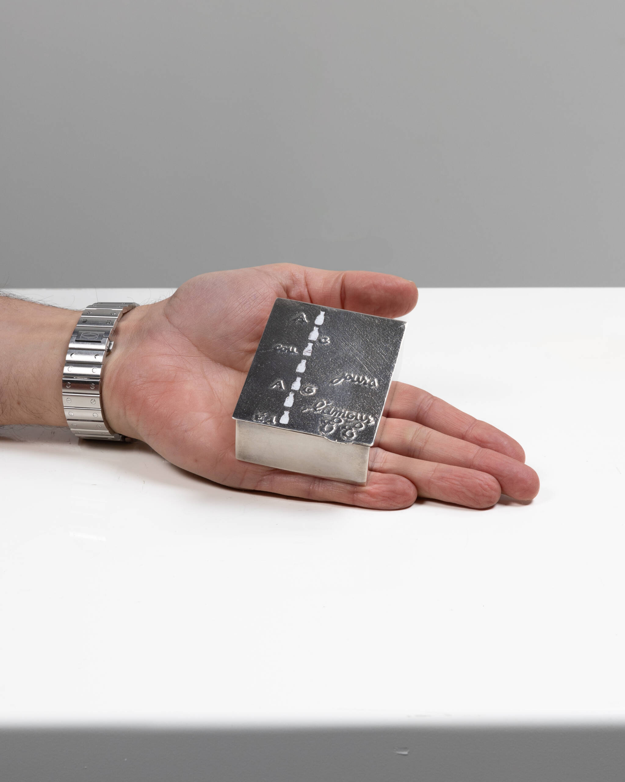 Boîte en bronze argenté à couvercle orné d’un rébus, par Line Vautrin.