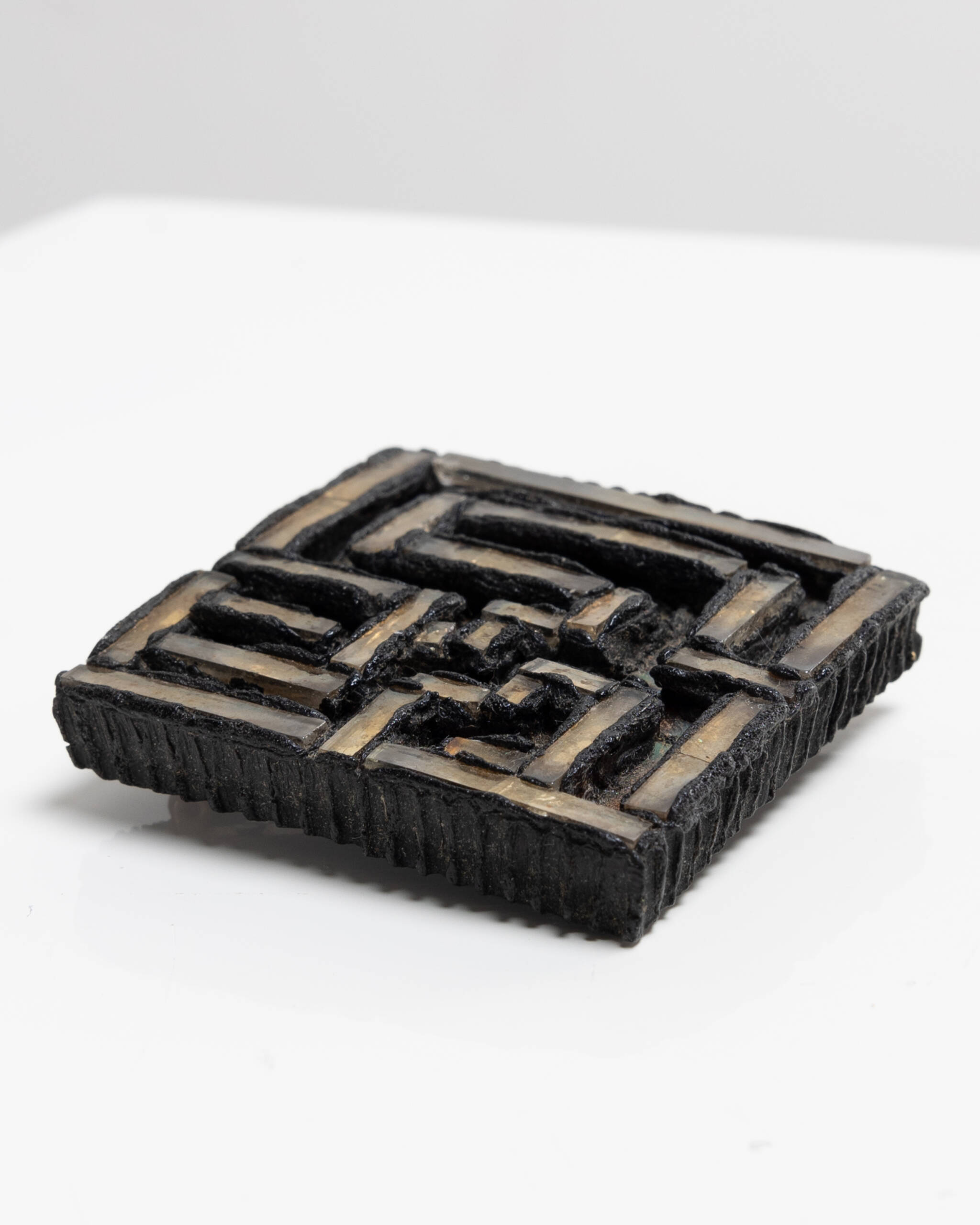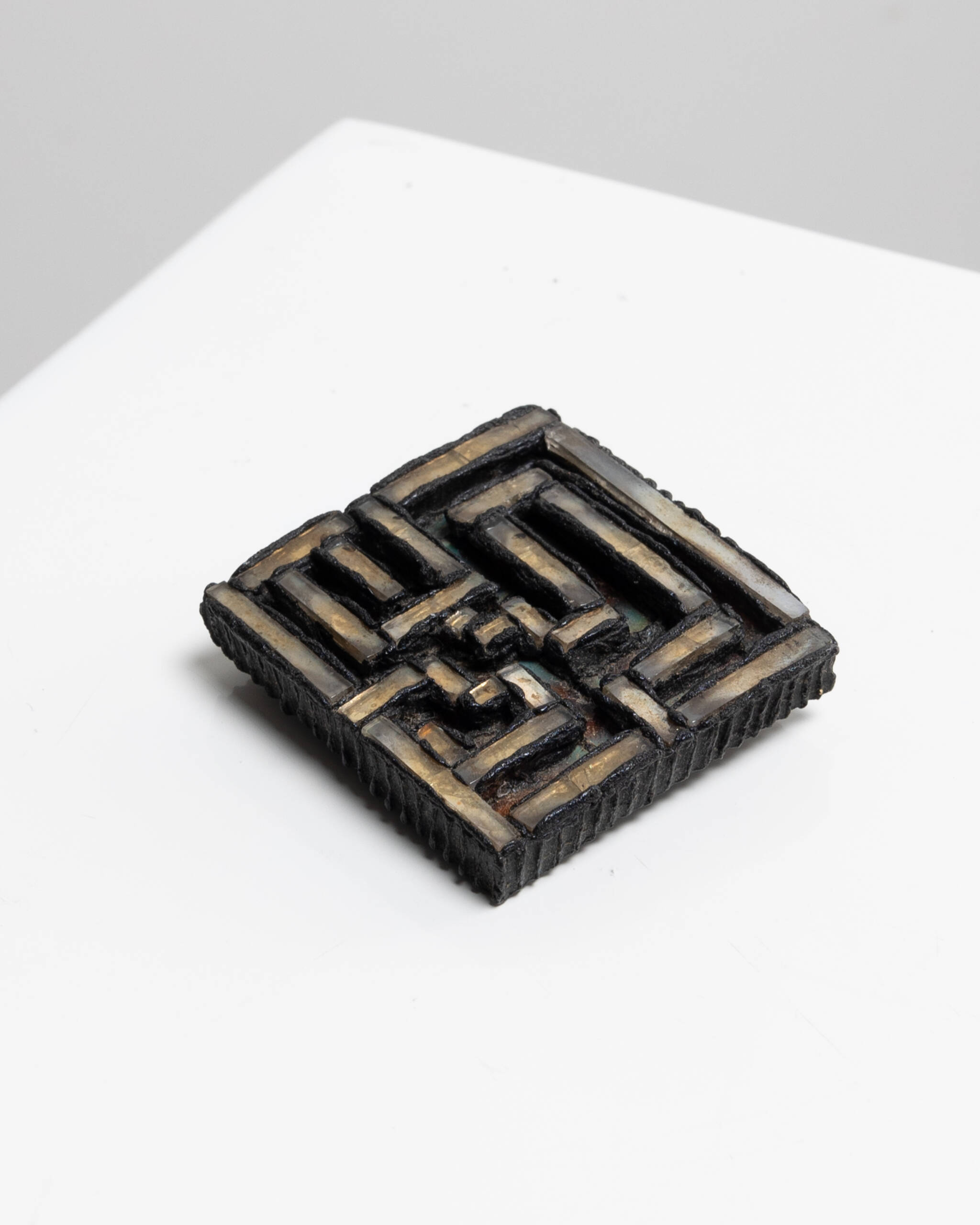 Broche en Talosel noir, de forme carrée, structurée par un relief géométrique rigoureusement composé. La surface est animée d’un réseau de petits volumes rectangulaires en léger ressaut, disposés selon un agencement quasi labyrinthique, créant un jeu de pleins et de creux très rythmé.