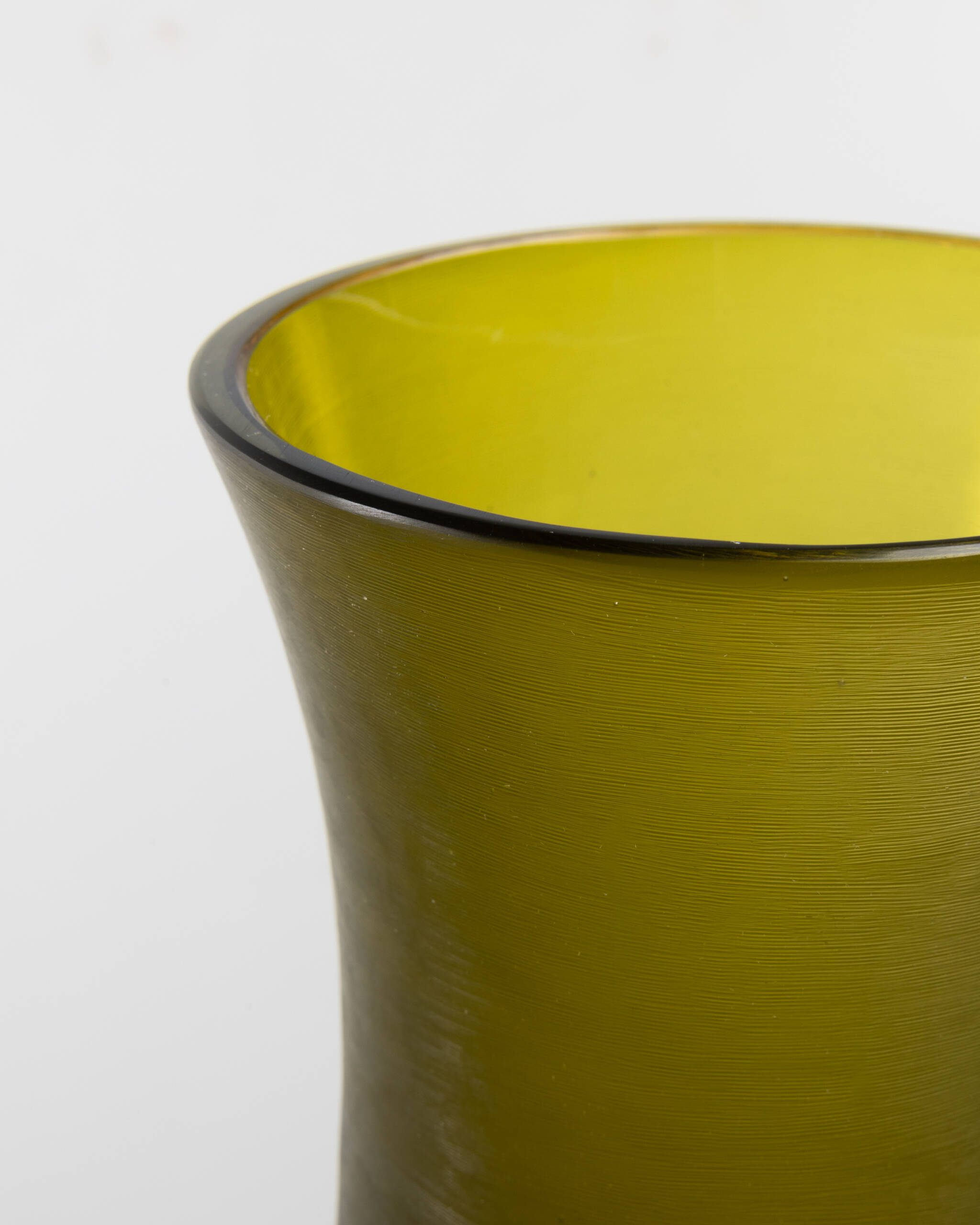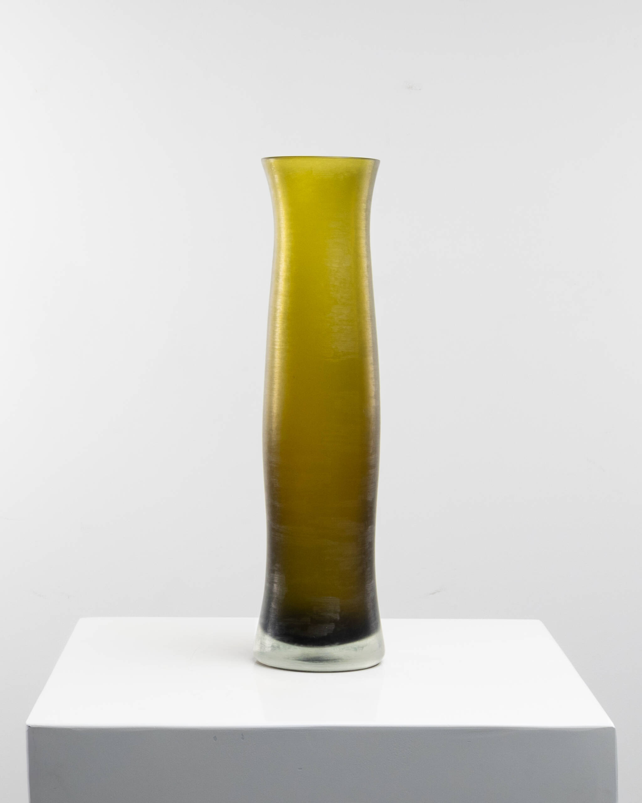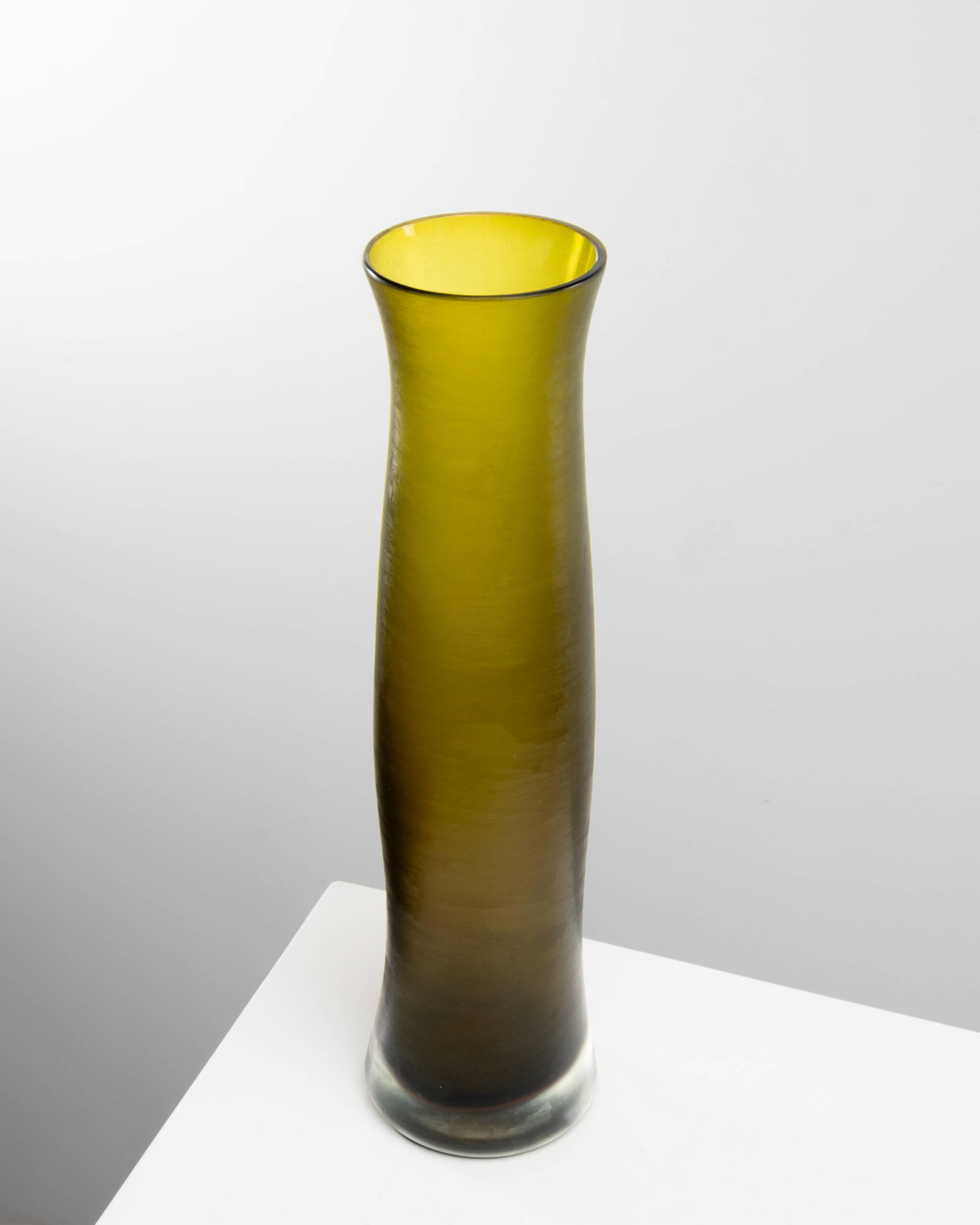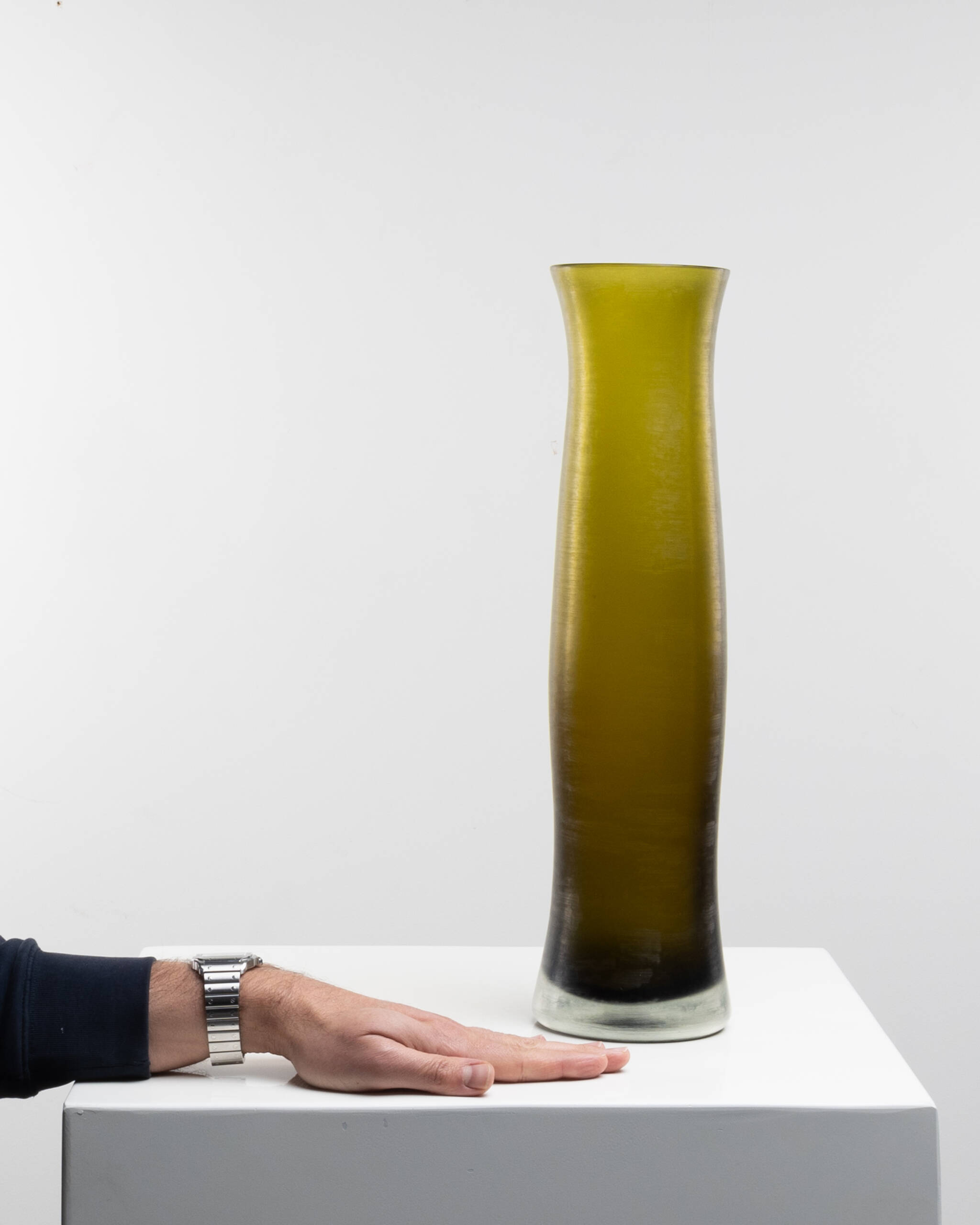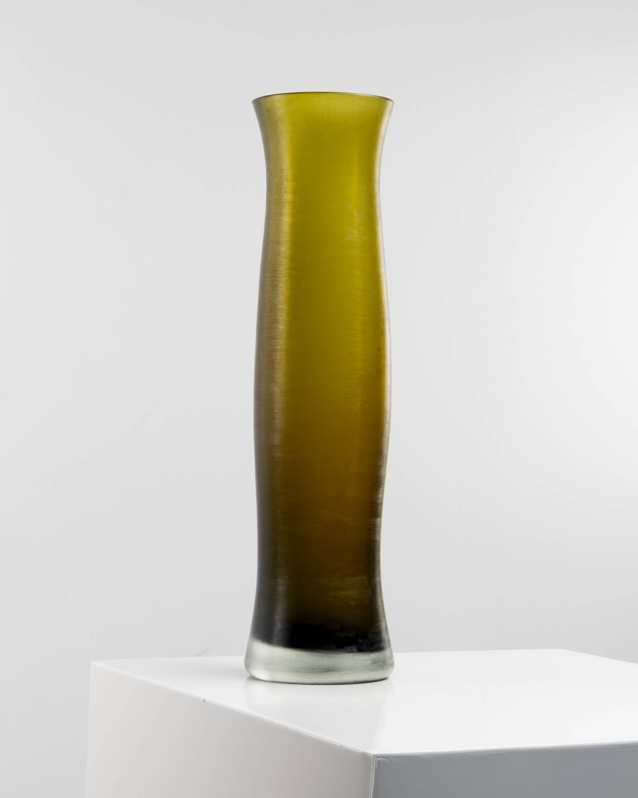 Grand Vase en verre soufflé à la surface finement taillée selon la technique inciso, emblématique du travail de Paolo Venini dans les années 1950. Sa forme élancée et sa teinte vert foncé (leaf-coloured) dégradée mettent en valeur la matière satinée, dont les incisions régulières diffusent la lumière avec une grande douceur.