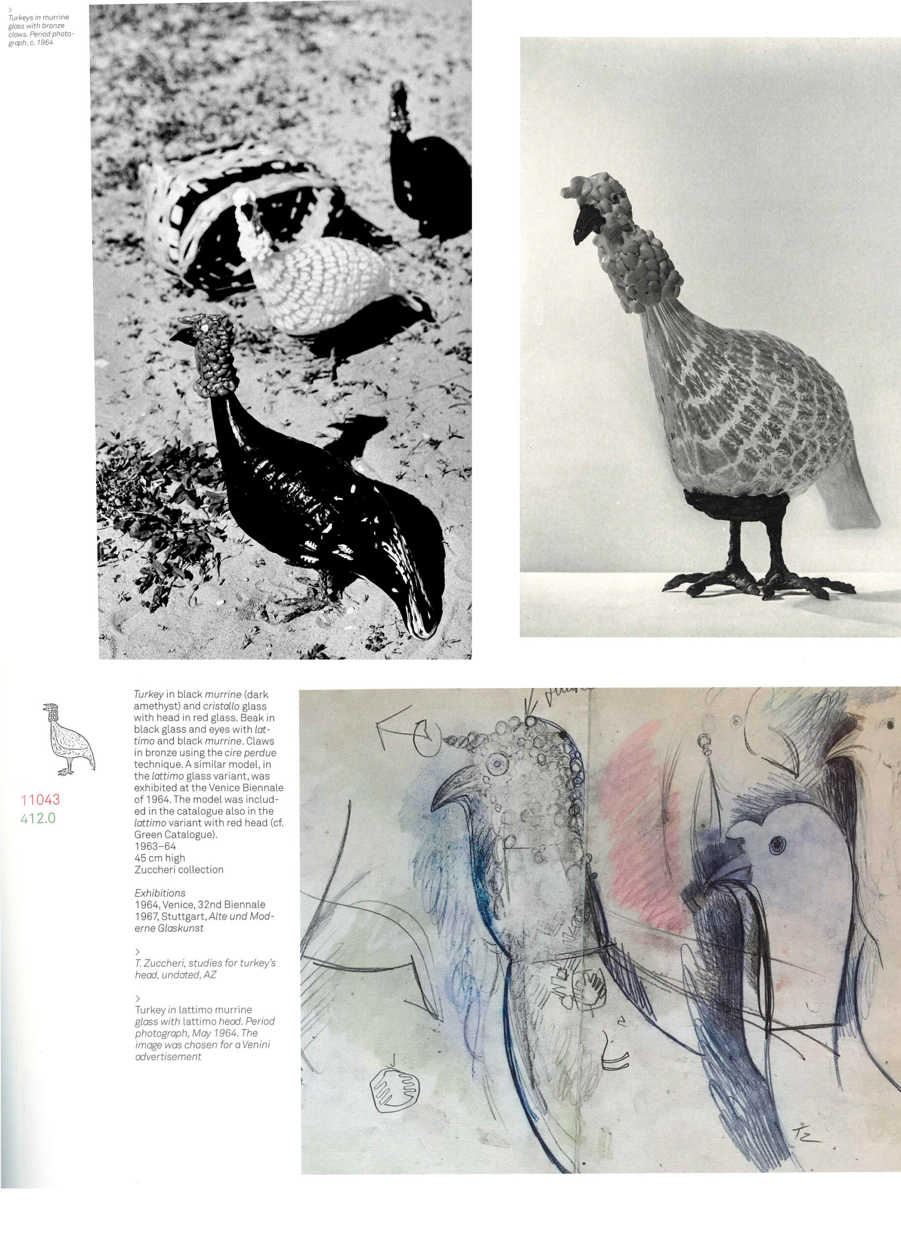 Sculpture – Tacchino (Dindon) en murrine reposant sur des pieds en bronze par Toni Zuccheri.